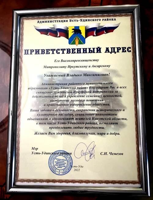 На богослужении присутствовал мэр Усть-Удинского района Сергей Николаевич Чемезов, который вручил митрополиту Максимилиану приветственный адрес.