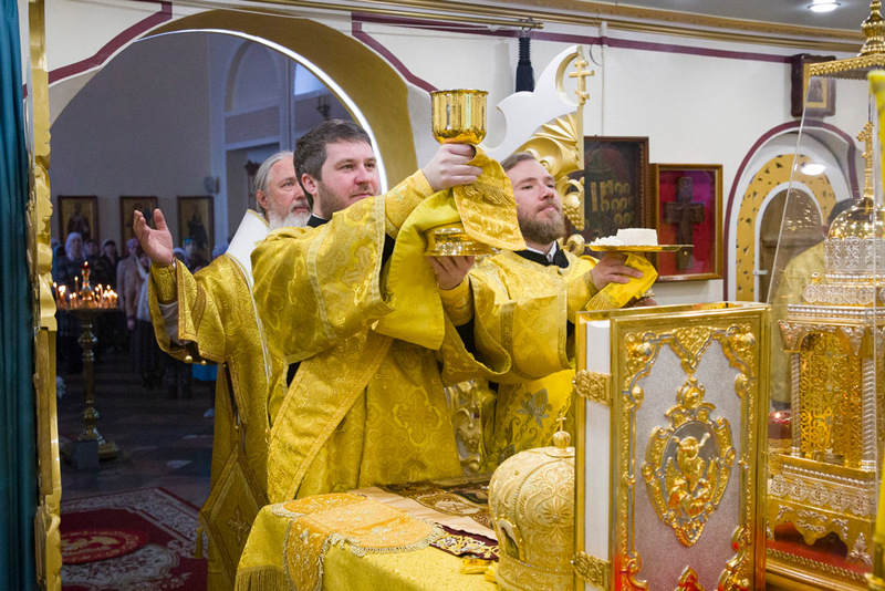 Его Высокопреосвященству сослужили: секретарь епархии иерей Антоний Васильев, настоятель храма протоиерей Димитрий Кирьян, протоиерей Андрей Скрынько, протоиерей Александр Немеров и иерей Димитрий Пономарев. Проповедь перед Причастием произнёс протоиерей Андрей Скрынько.