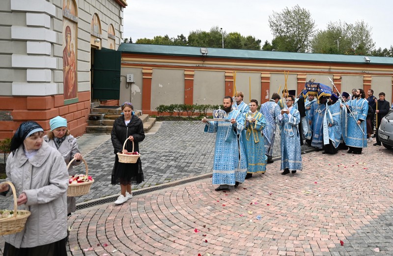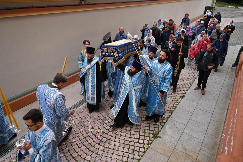 Были прочитаны «Похвалы, или священное последование на святое преставление Пресвятыя Владычицы нашея Богородицы и Приснодевы Марии», после чего, по окончании великого славословия при пении заключительного «Святый Боже» совершился крестный ход со святой плащаницей вокруг храма.