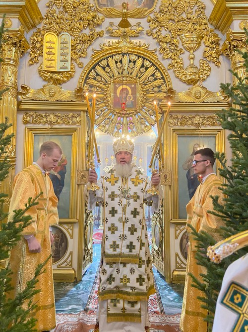 Владыка Максимилиан поздравил всех присутствующих со всеми праздничными поводами дня и продолжающимися Святочными днями и в своем назидательном слове сделал акцент на борение с грехом, напомнив присутствующим и о примере подвига пророка Божия Иоанна Предтечи, следствием служения которого стала и наша встреча с Богом; и о словах преподобного Серафима Саровского о том, что в любое время люди могут быть святыми, но не имеют святости, «потому что не имеют решимости».