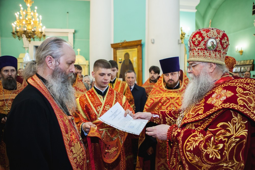 На Входе состоялось награждение священнослужителей. За усердное служение Церкви Божией, настоятель храма великомученицы Екатерины г. Петрозаводска протоиерей Андрей Верещагин удостоен права ношения креста с украшениями; клирик Александро-Невского собора протоиерей Роман Чадаев, настоятель храма в честь Рождества Христова в г. Суоярви протоиерей Вячеслав Володин и настоятель храма великомученика Пантелеимона п. Гирвас протоиерей Анатолий Вяхирев удостоились права ношения палицы; настоятель храма в честь Покрова Пресвятой Богородицы п. Пряжа иерей Константин Кукушкин и клирик храма во имя иконы Пресвятой Богородицы «Живоносный Источник» п. Марциальные Воды иерей Петр Кирьянов - правом ношения камилавки, а клирик Сретенского храма иерей Михаил Васильев - правом ношения набедренника. Диаконы Дионисий Битарашвили (храм вмц. Екатерины г. Петрозаводска) и Виктор Панкевич (храм Рождества Христова г. Суоярви) были награждены двойным орарем.