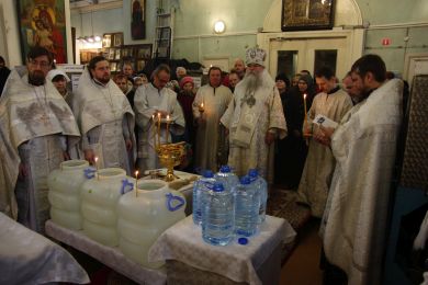 По заамвонной молитве митрополит Константин совершил чин великого освящения воды. По окончании чина владыка Константин обратился к собравшимся с проповедью, в которой поздравил прихожан Крестовоздвиженского собора с праздником Навечерия Богоявления. «Никогда за всю историю человечества, - сказал Владыка, - не было таким очевидным образом явлено триединства Божьего, как в событии Богоявления. С неба раздался голос Бога Отца: «Сей есть Сын Мой возлюбленный». Возлюбленный Сын, воплотившееся второе Лицо Пресвятой Троицы, получивший земное имя Иисус. Оттуда же, из космических бездн, из которых говорил голос Отца, видимым образом в виде голубя изошел Дух Святый. Для нас, православных, это событие говорит об очень важной догматической истине. Все четыре евангелиста согласно свидетельствуют о том, что в Богоявлении Дух Святый исходит только от Отца. Это очевидным образом явлено и со всей ясностью говорит о том, что не правы те, кто считает, что Дух исходит от Отца и Сына. И вот эту истину, которая запечатлена в Никео-Цареградском Символе веры, мы должны исповедовать как один из важнейших спасительных догматов христианской веры».