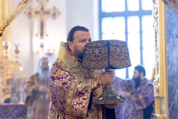 На мирной и сугубой ектениях были вознесены молитвы о Российском воинстве и о мире. По запричастном стихе проповедь произнёс насельник обители иеромонах Гермоген (Рубан).