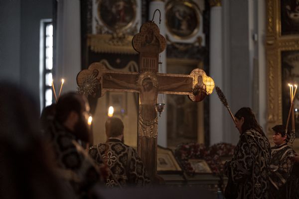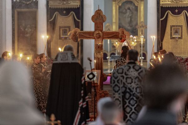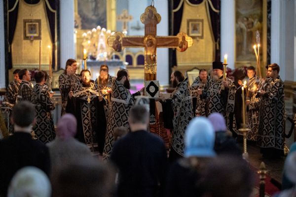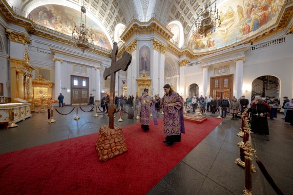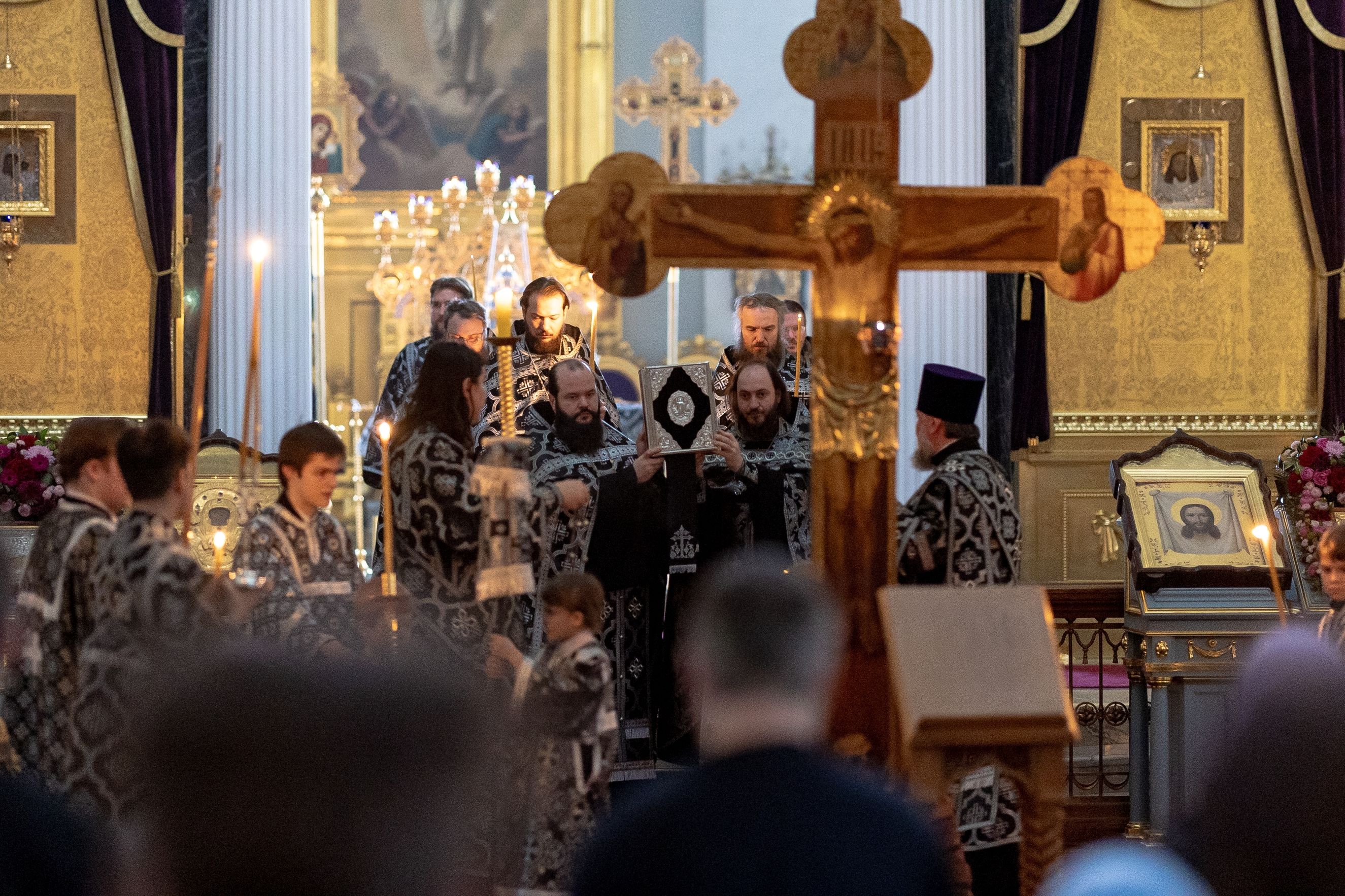 Во время пения стихиры «Тебе, одеющагося светом, яко ризою» духовенство изнесло Евангелие на середину храма. Перед Распятием был прочитан акафист спасительным Страстям Христовым.
