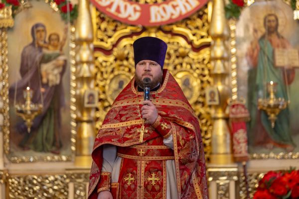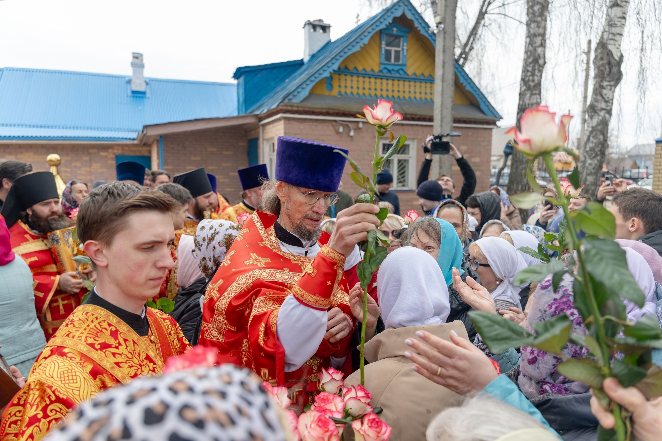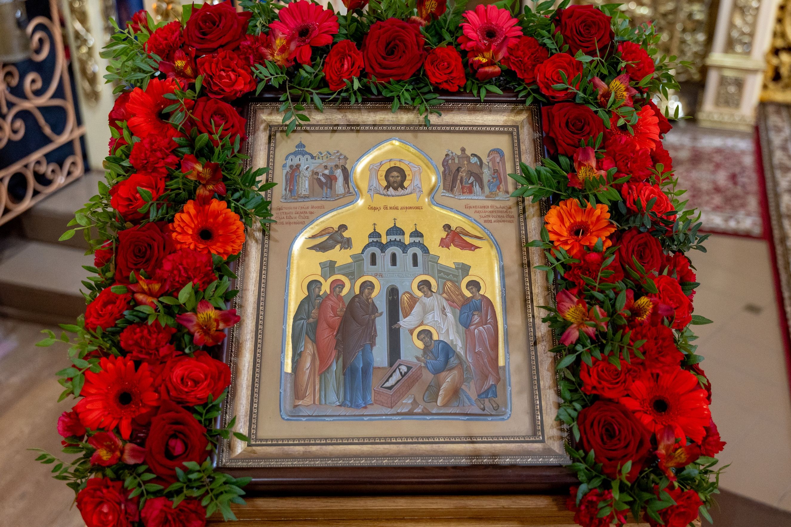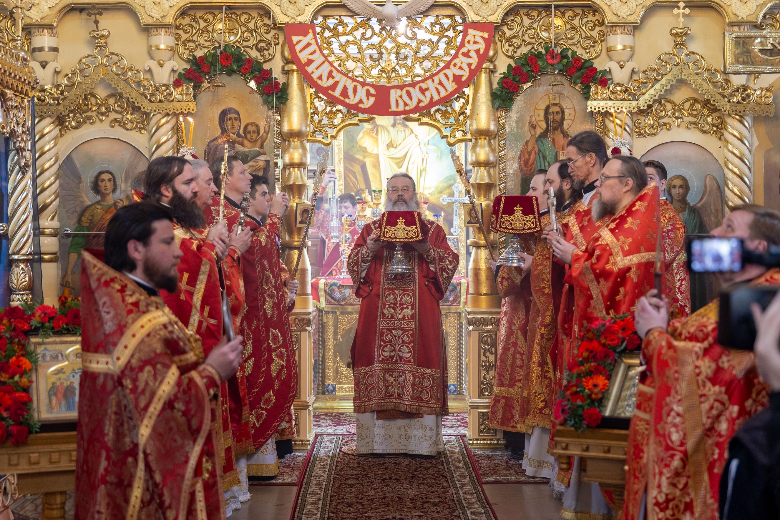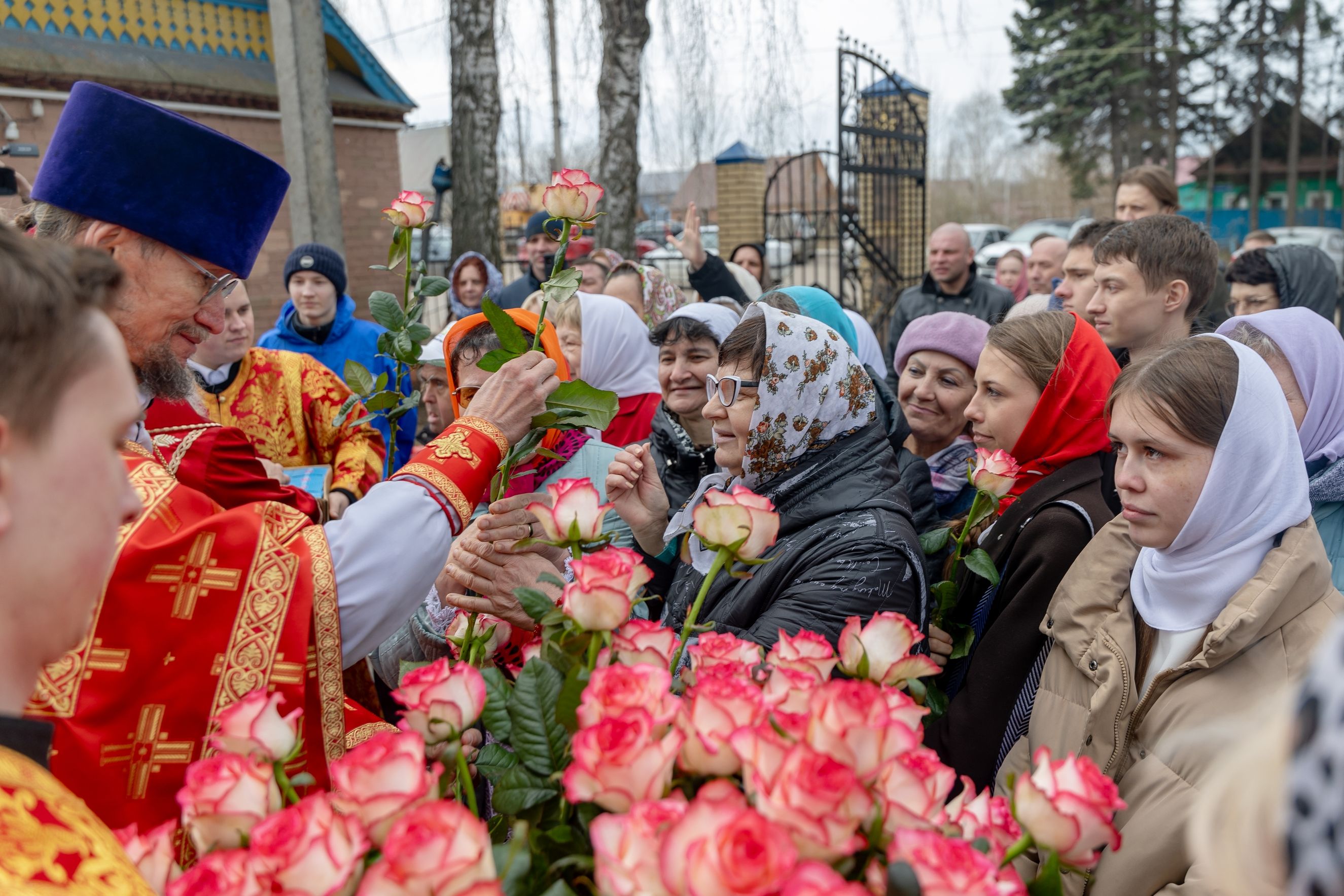 Дорогие братья и сестры, всех вас поздравляем с праздником Святой Пасхи. Сугубо сегодня поздравляем тех, кто продолжает дело святых жён-мироносиц. Присутствующих на богослужении женщин поздравляем с православным женским днём.