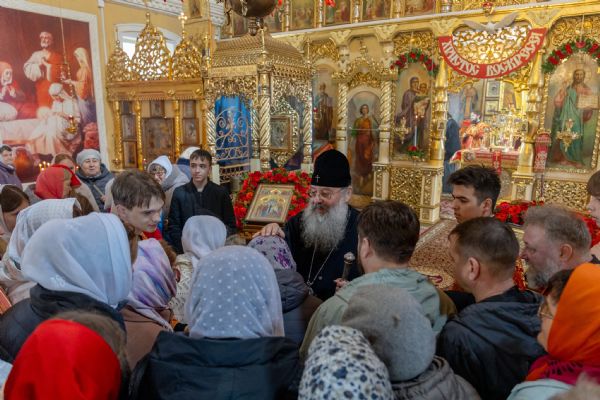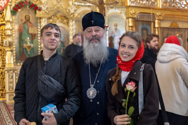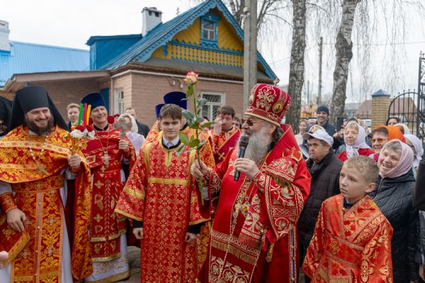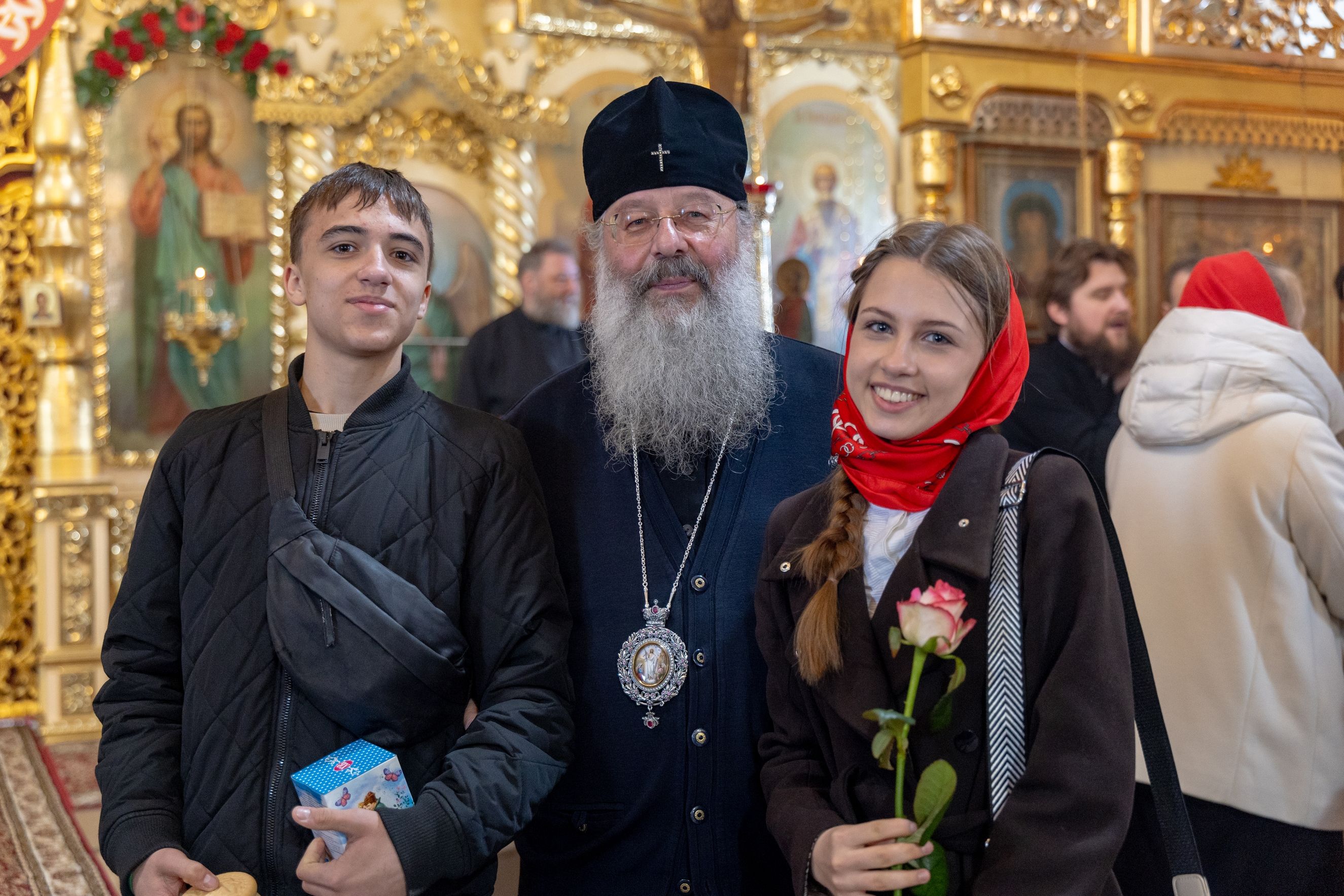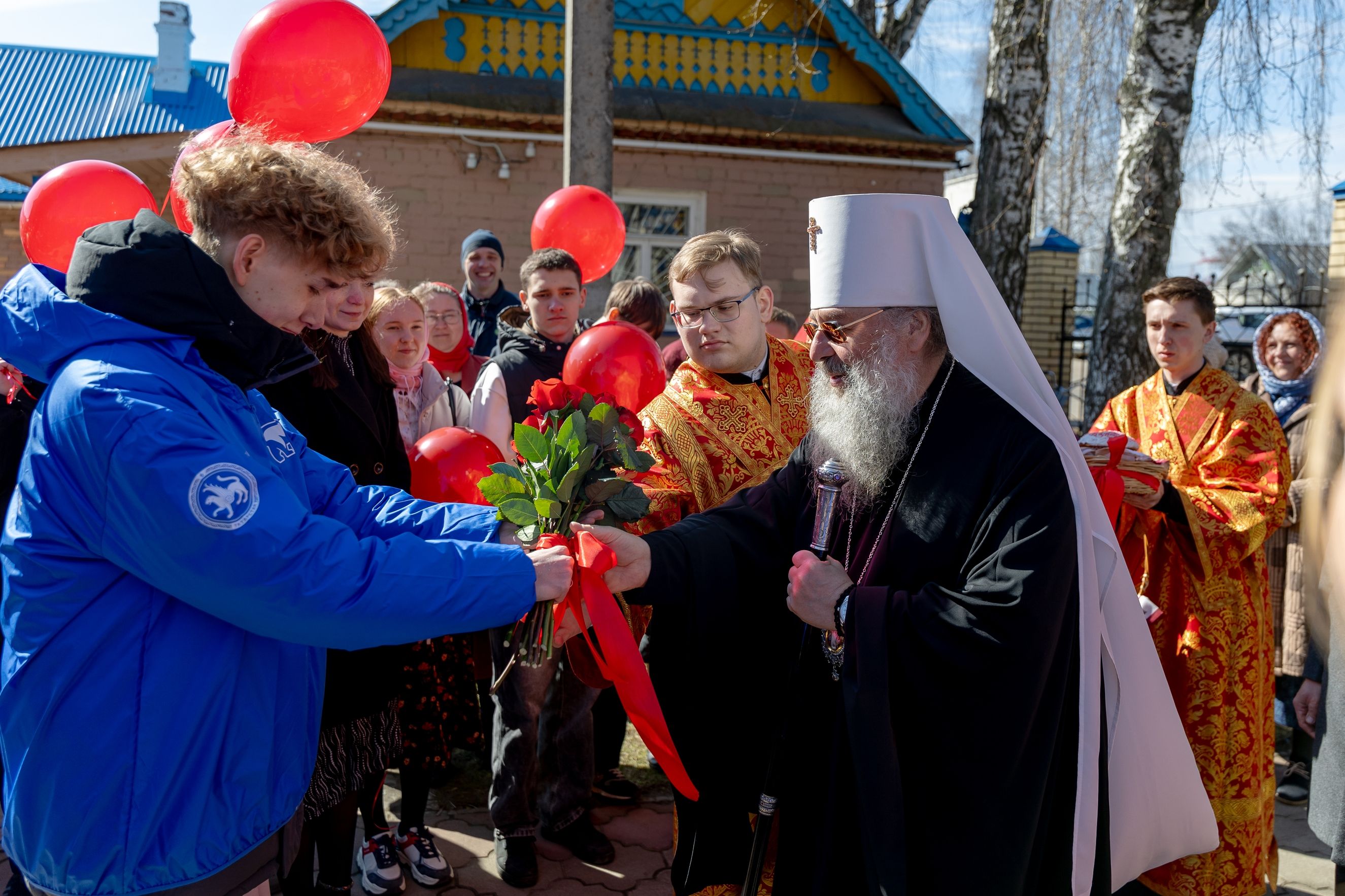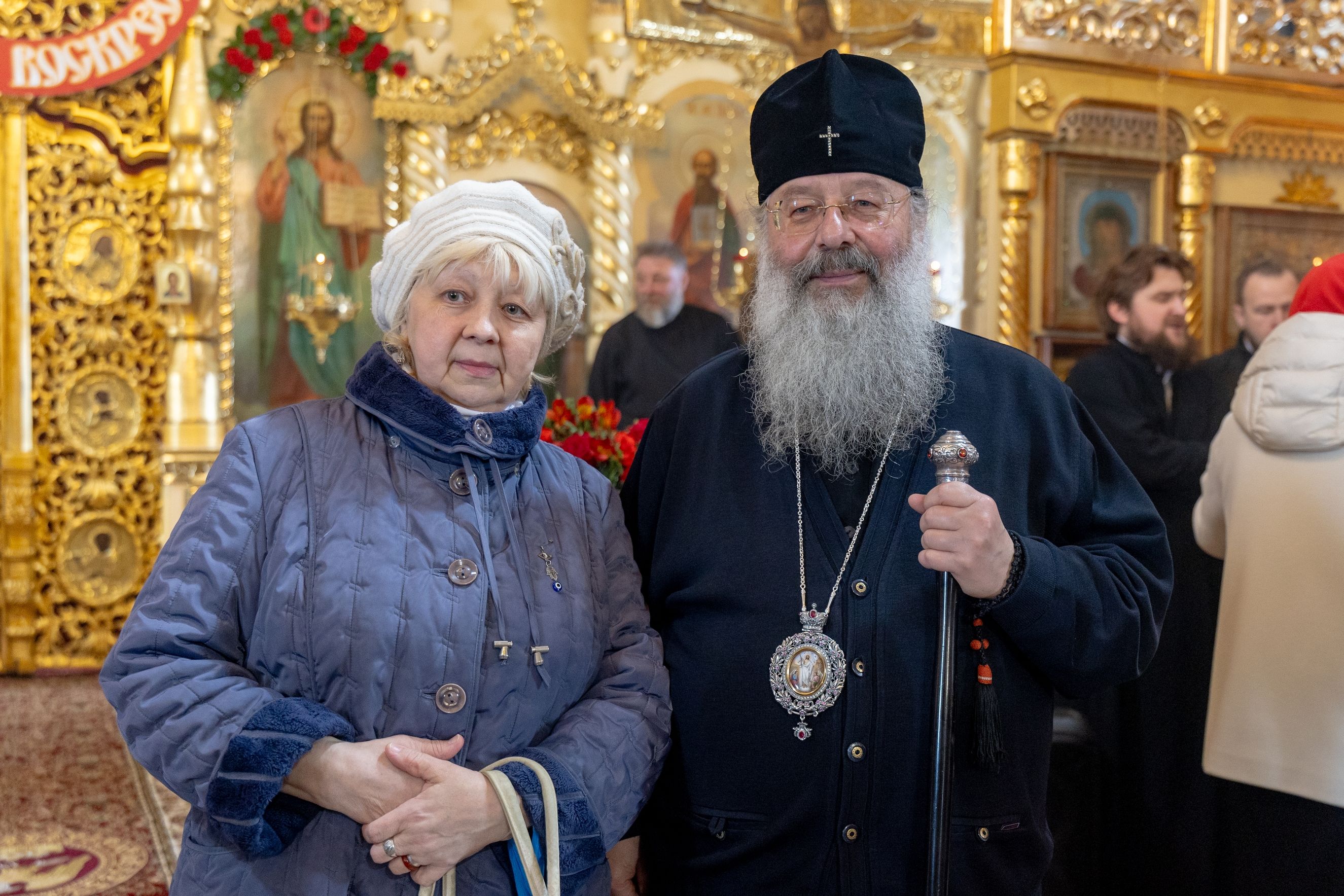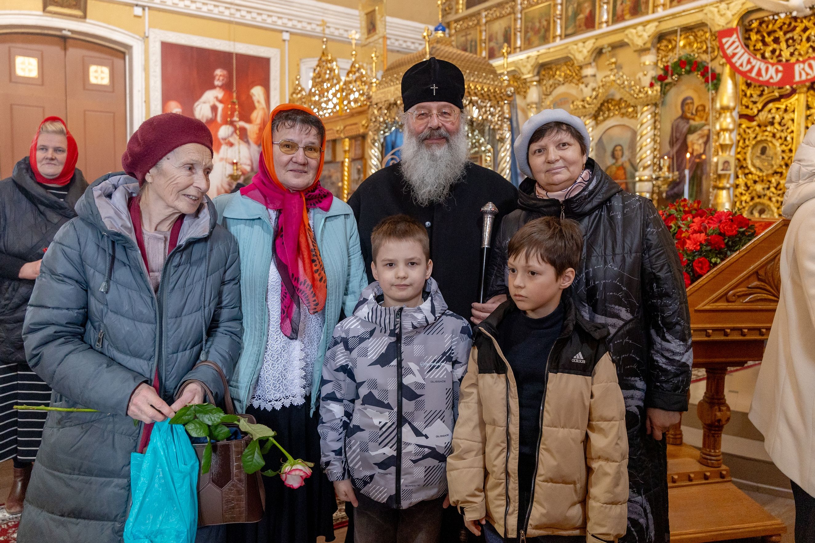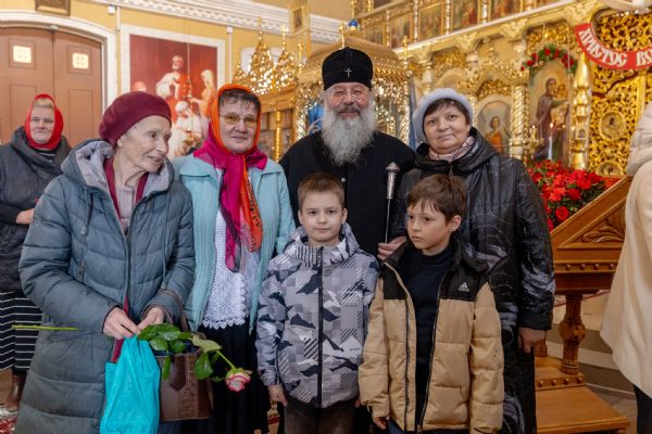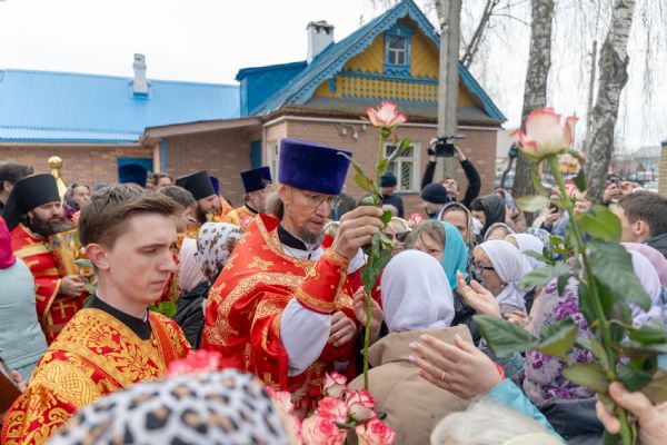 Митрополит Кирилл преподал верующим благословение. Священнослужители подарили присутствующим на богослужении женщинам цветы.
