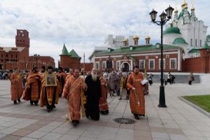 Прихожане трех городских храмов: собора Воскресения Христова, собора Вознесения Господня и собора Благовещения Пресвятой Богородицы вместе с настоятелями и духовенством после Божественной литургии пришли крестным ходом к памятнику святых Кирилла и Мефодия.