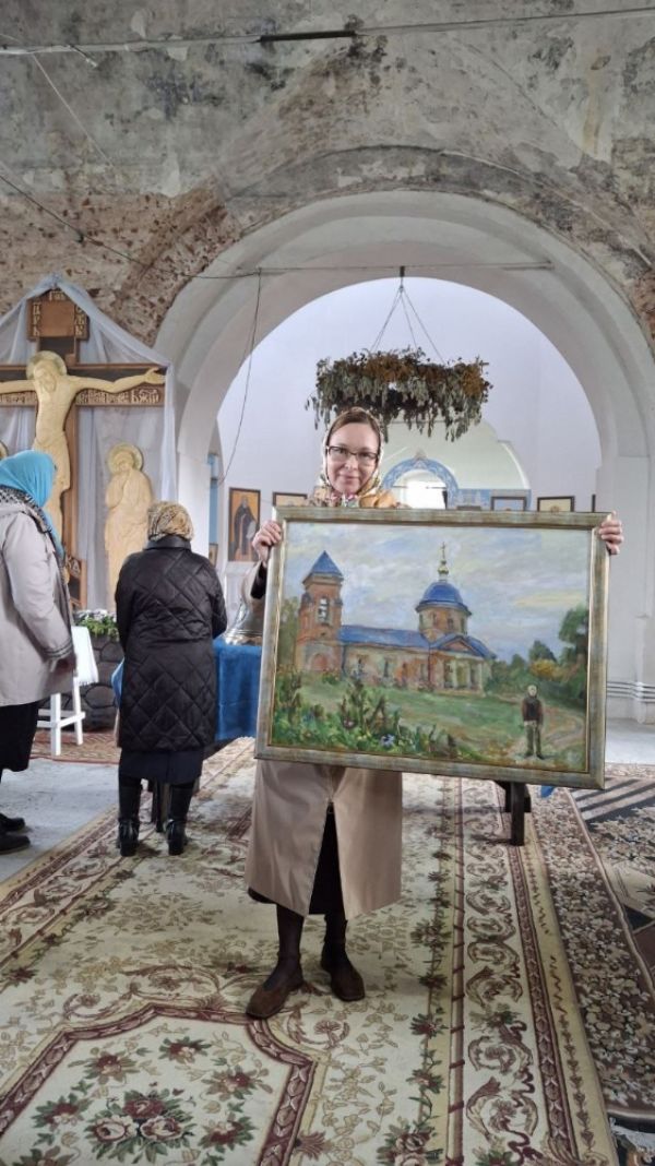 От лица всего прихода отец Феодор выразил особую благодарность Евгении Власовой, пожертвовавшей колокола для храма и постоянно помогающей в его восстановлении. В знак признательности ей была подарена картина с изображением Тихвинского храма – как символ духовной связи и памяти.