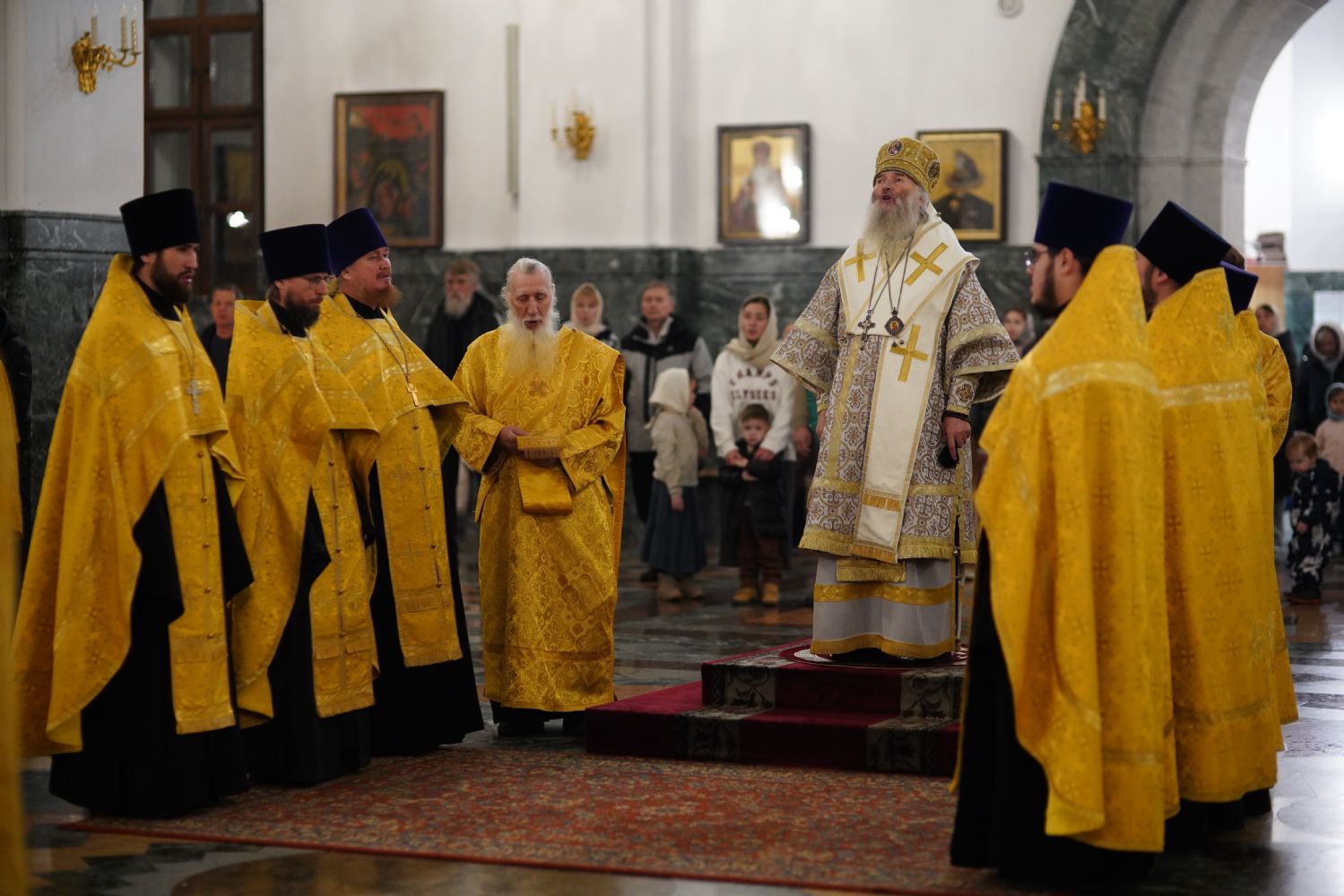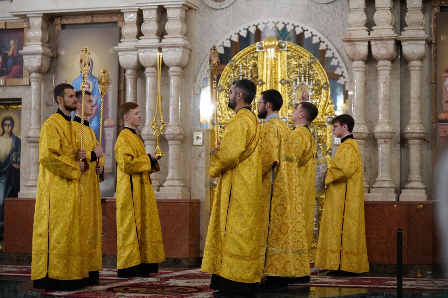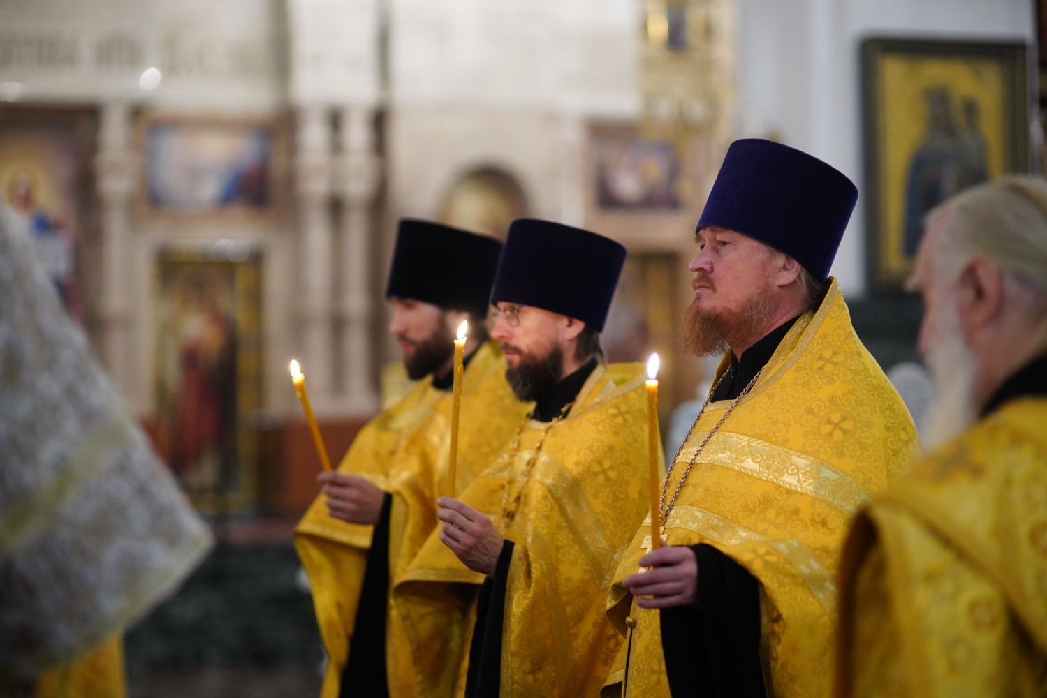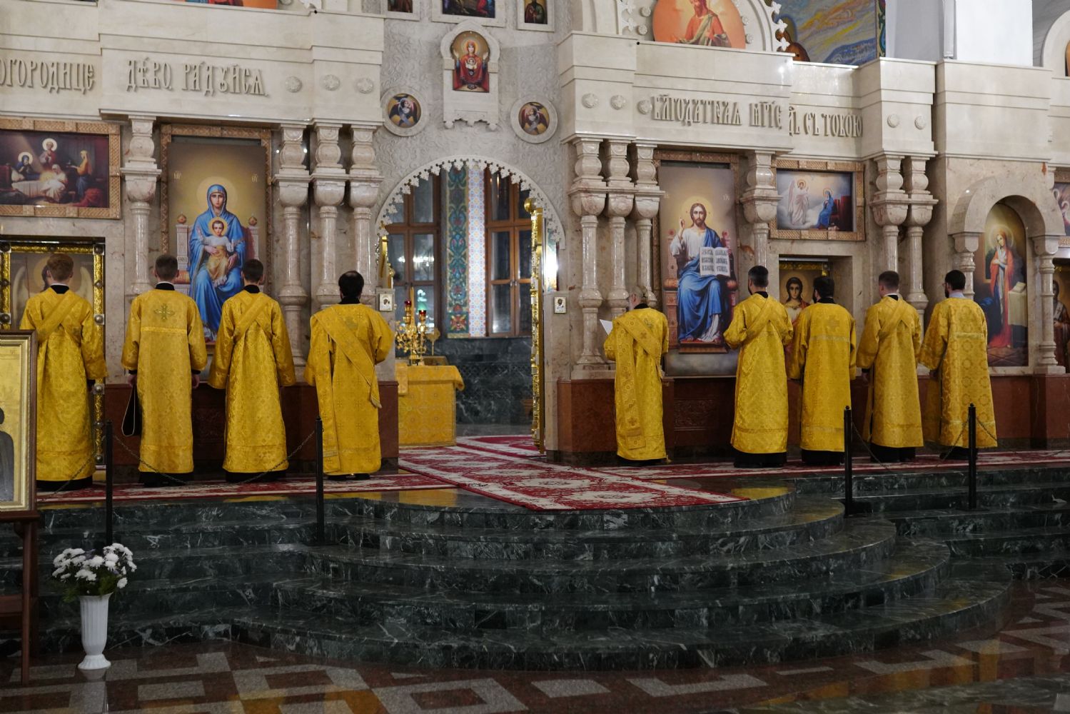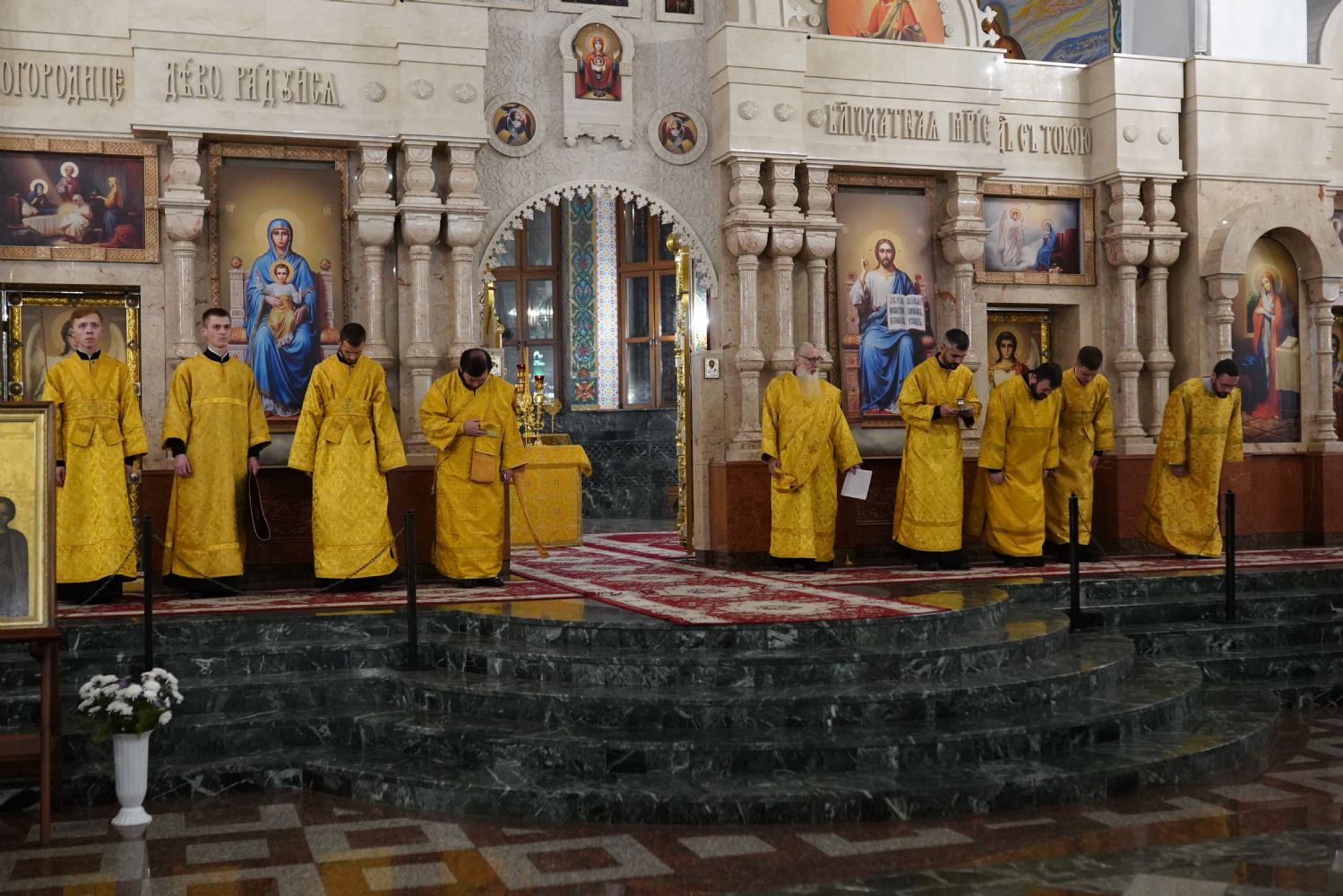 Его Высокопреосвященству сослужили ключарь собора протоиерей Сергий Поглазов, клирики собора иереи Никифор Захаров, Евгений Самойлов, Александр Староверов, Иоанн Милютин и диакон Артемий Бобоч, а также протодиакон Михаил Козловский и клирик Минусинской епархии иерей Матфей Фокша. Песнопения исполняли старший и младший составы архиерейского детско-юношеского хора «Благовест» под управлением регентов Татьяны Черновой и Надежды Поздеевой.