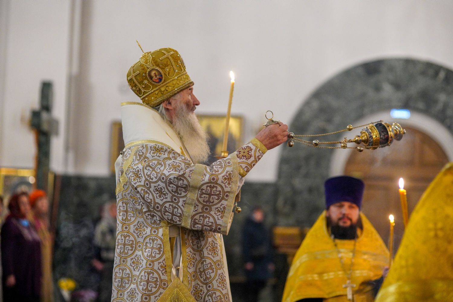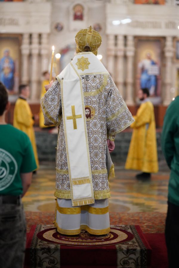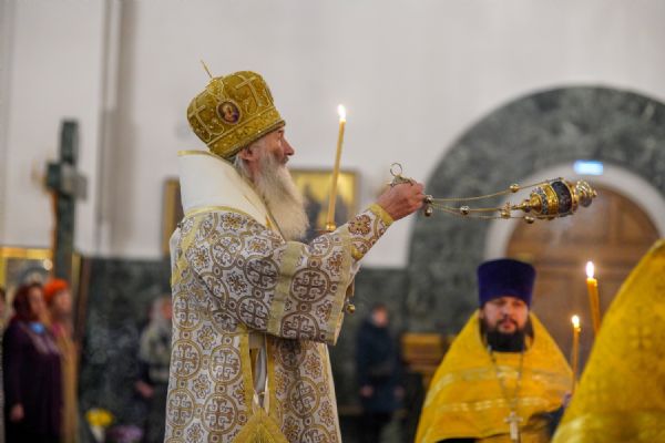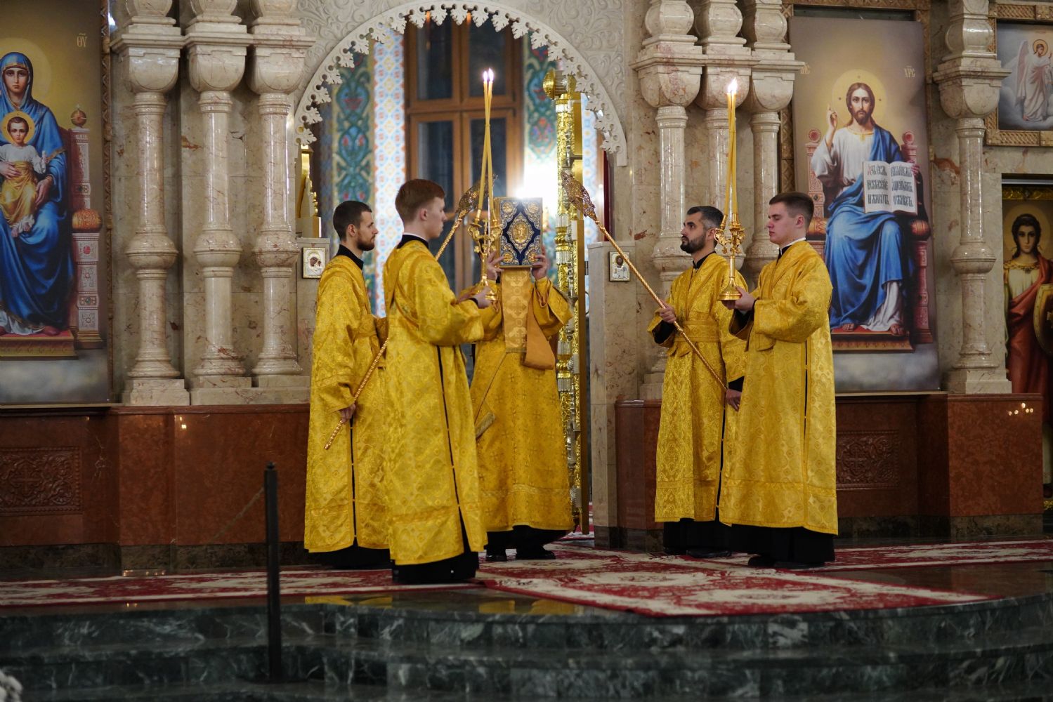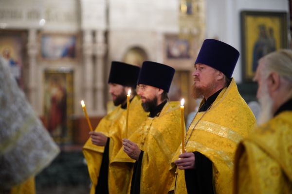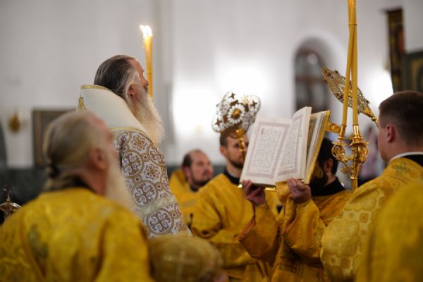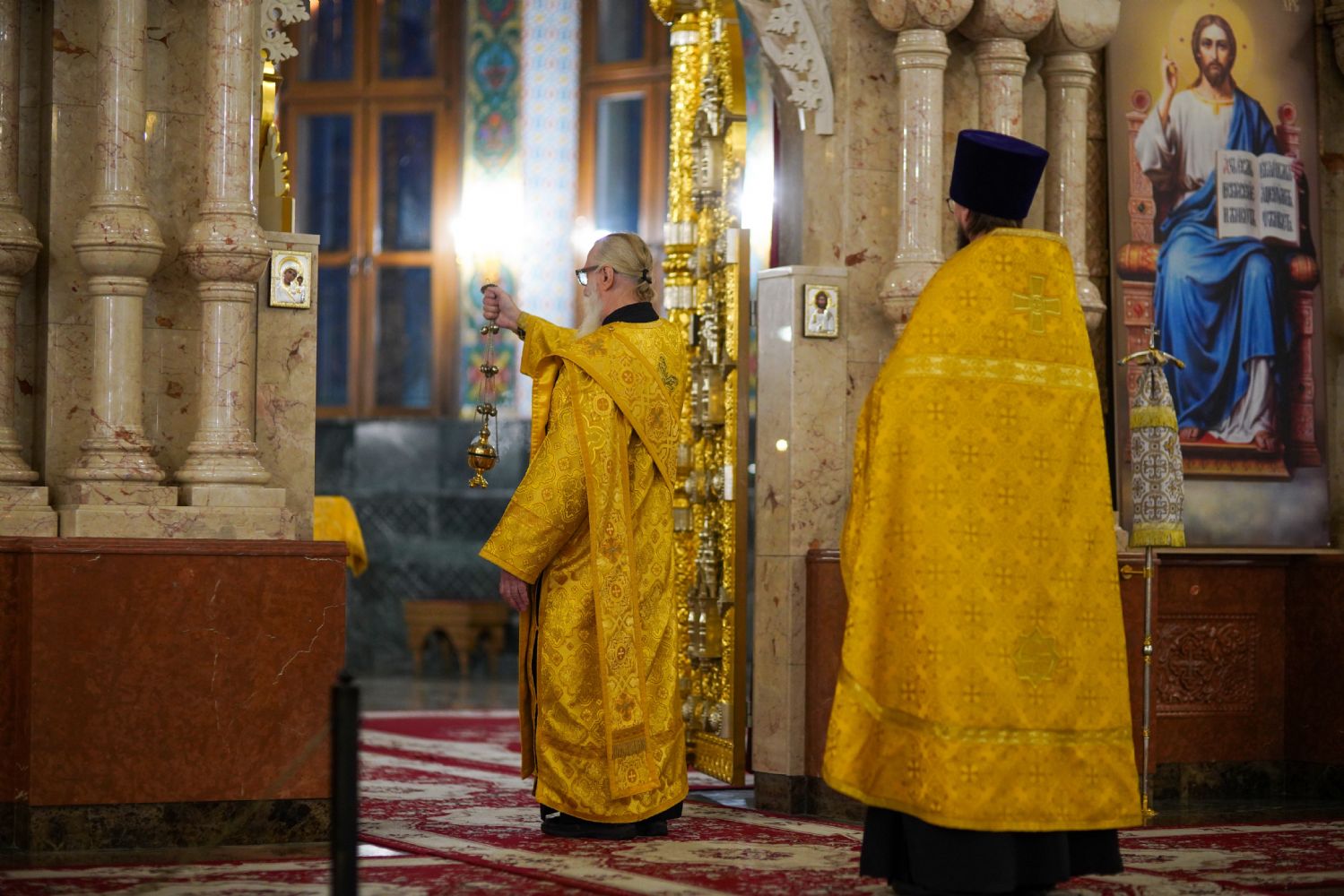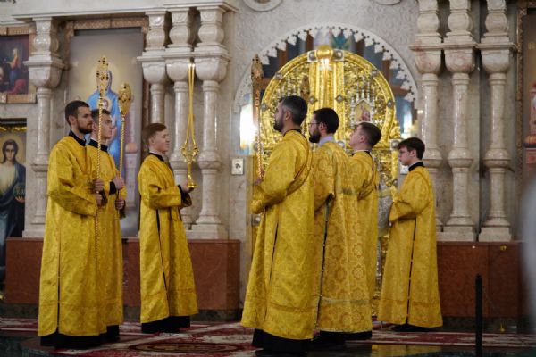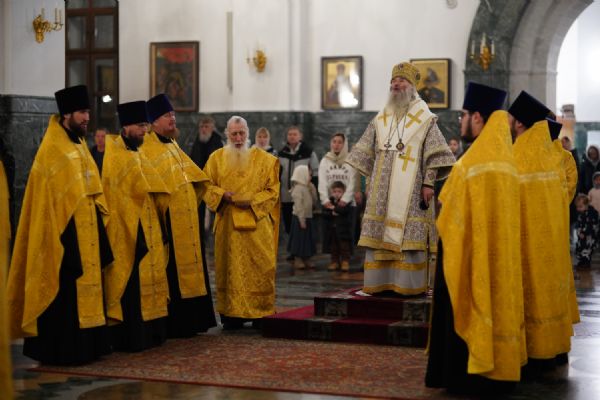 Его Высокопреосвященству сослужили ключарь собора протоиерей Сергий Поглазов, клирики собора иереи Никифор Захаров, Евгений Самойлов, Александр Староверов, Иоанн Милютин и диакон Артемий Бобоч, а также протодиакон Михаил Козловский и клирик Минусинской епархии иерей Матфей Фокша. Песнопения исполняли старший и младший составы архиерейского детско-юношеского хора «Благовест» под управлением регентов Татьяны Черновой и Надежды Поздеевой.