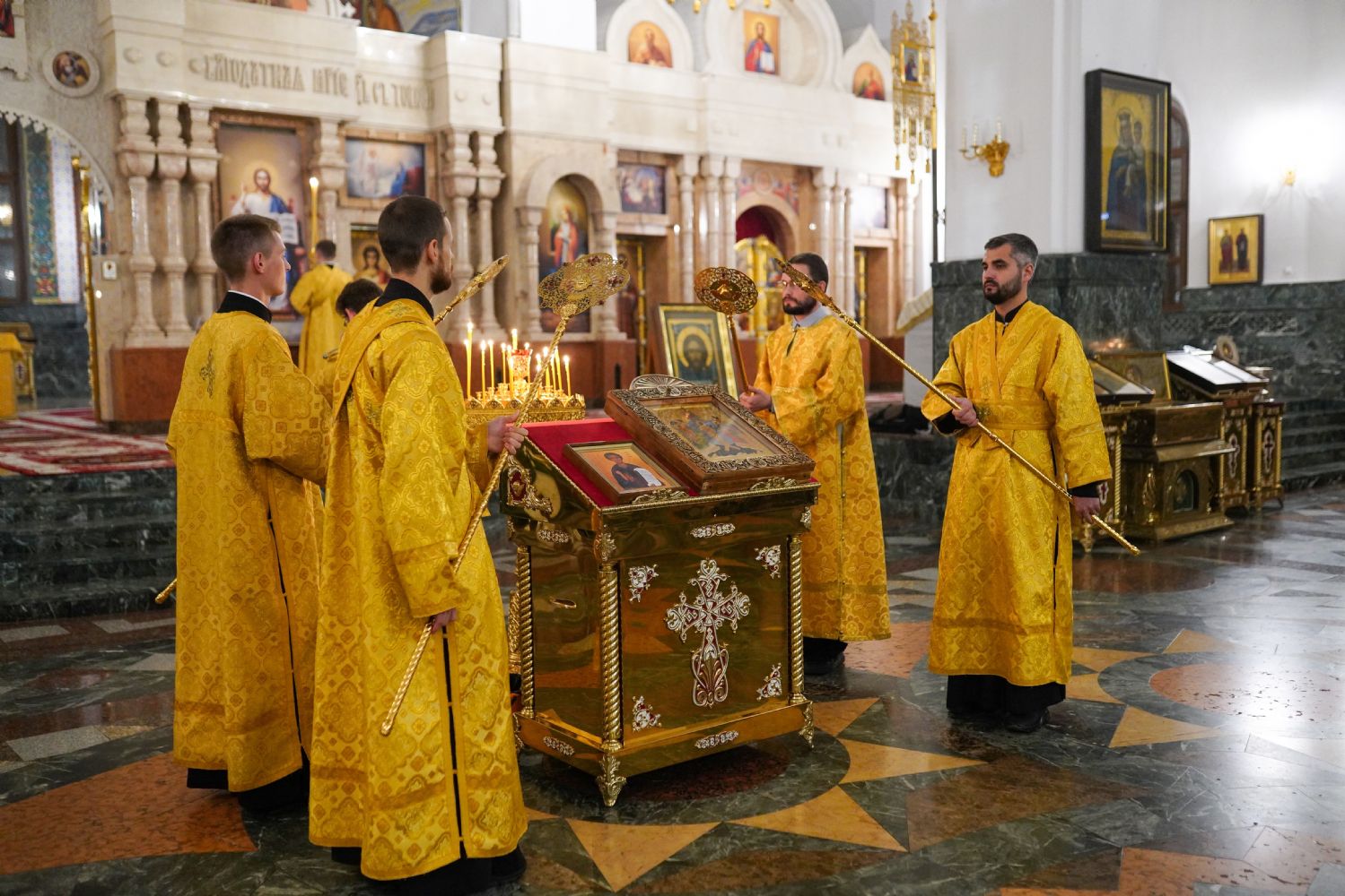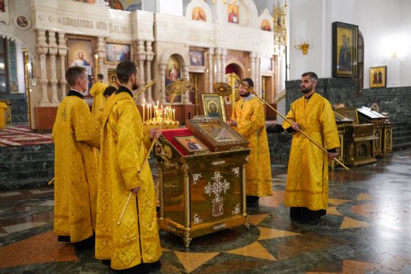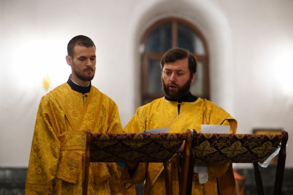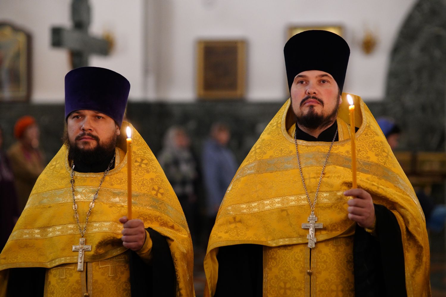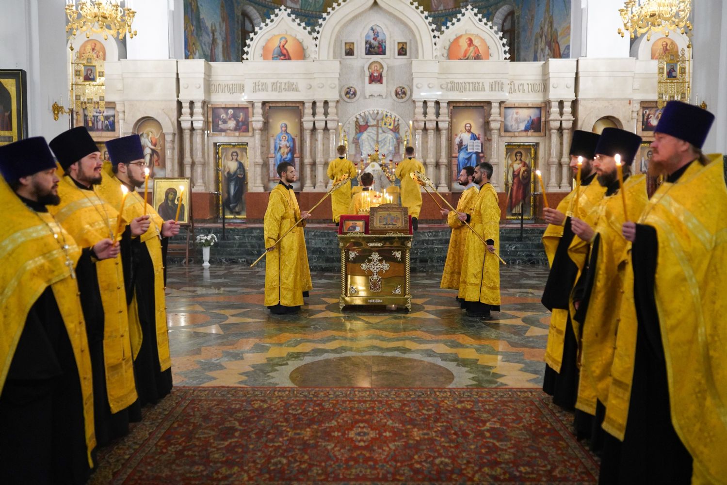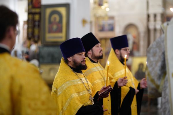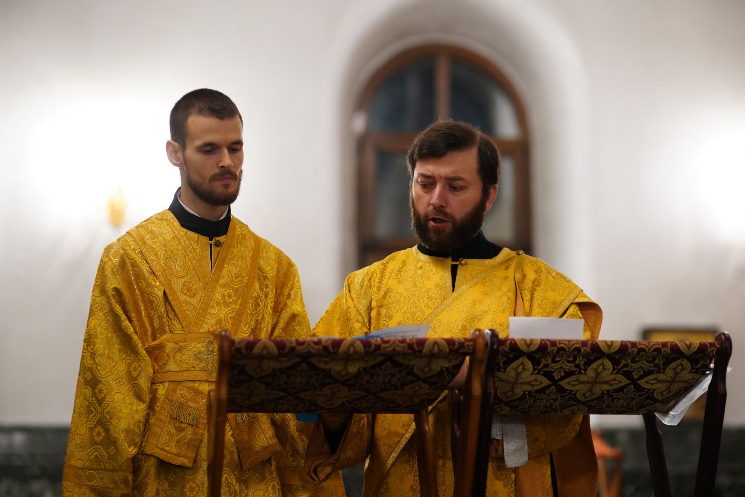 Его Высокопреосвященству сослужили ключарь собора протоиерей Сергий Поглазов, клирики собора иереи Никифор Захаров, Евгений Самойлов, Александр Староверов, Иоанн Милютин и диакон Артемий Бобоч, а также протодиакон Михаил Козловский и клирик Минусинской епархии иерей Матфей Фокша. Песнопения исполняли старший и младший составы архиерейского детско-юношеского хора «Благовест» под управлением регентов Татьяны Черновой и Надежды Поздеевой.