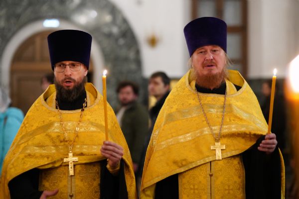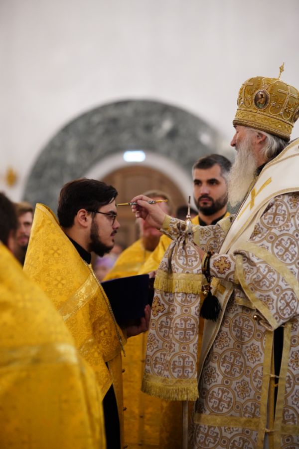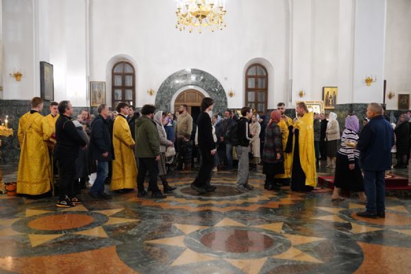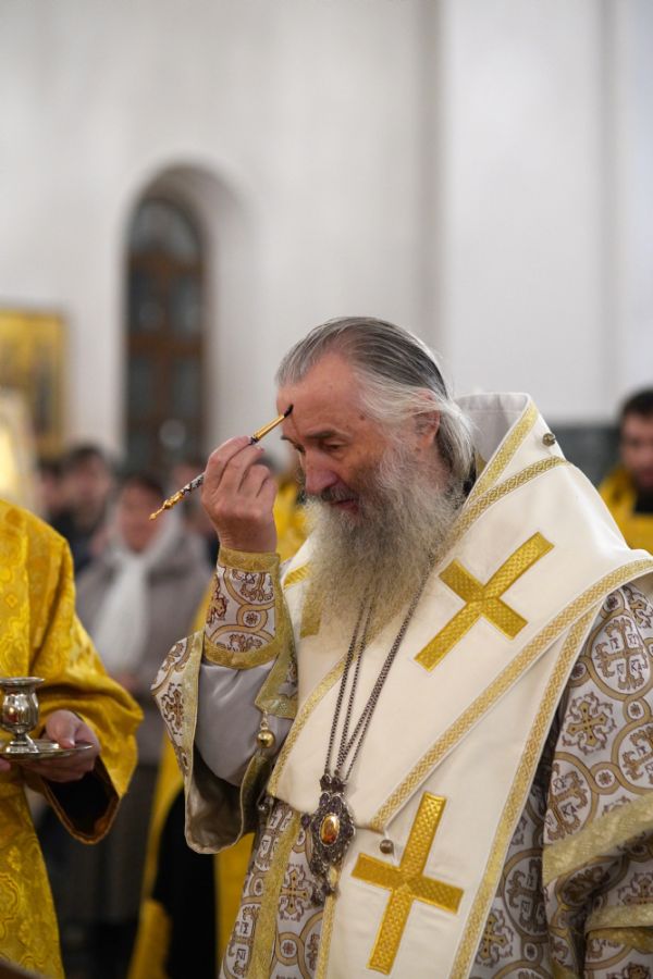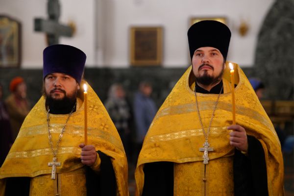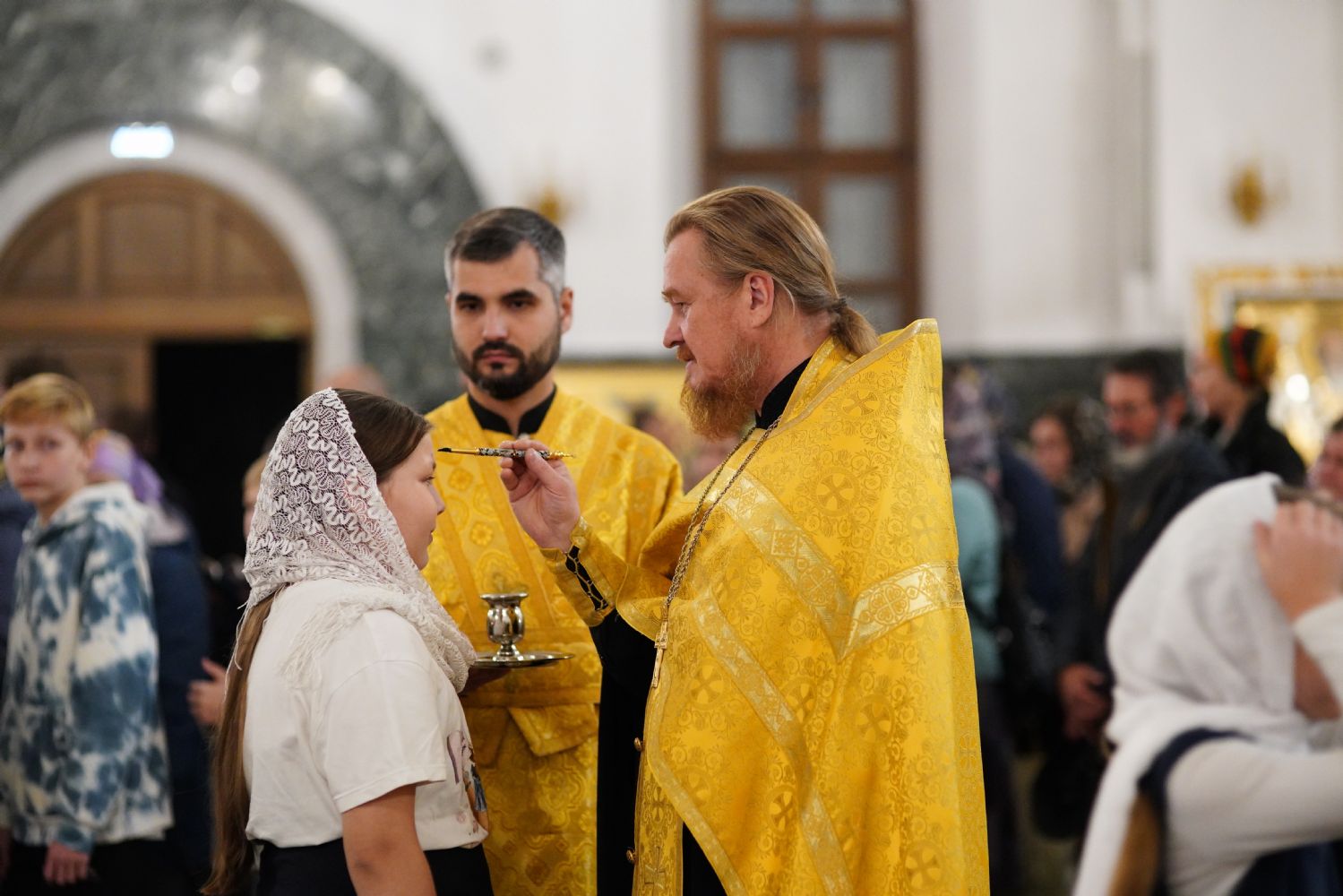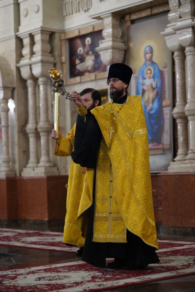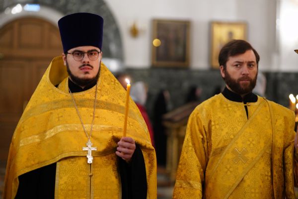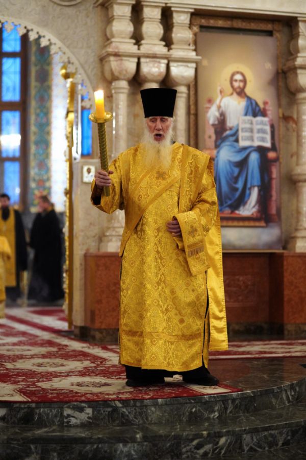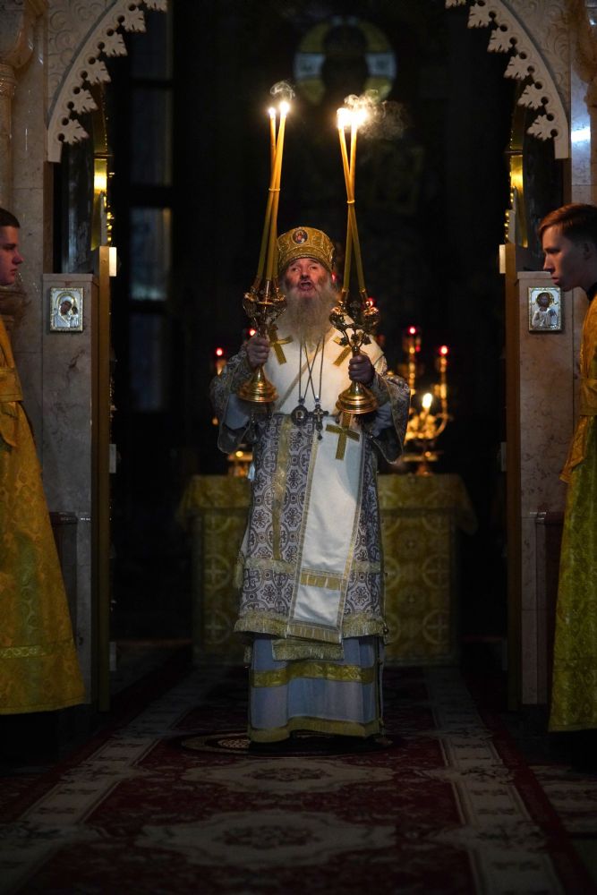 Его Высокопреосвященству сослужили ключарь собора протоиерей Сергий Поглазов, клирики собора иереи Никифор Захаров, Евгений Самойлов, Александр Староверов, Иоанн Милютин и диакон Артемий Бобоч, а также протодиакон Михаил Козловский и клирик Минусинской епархии иерей Матфей Фокша. Песнопения исполняли старший и младший составы архиерейского детско-юношеского хора «Благовест» под управлением регентов Татьяны Черновой и Надежды Поздеевой.