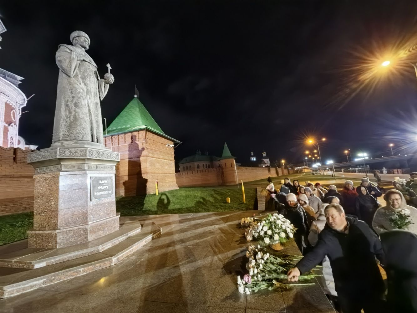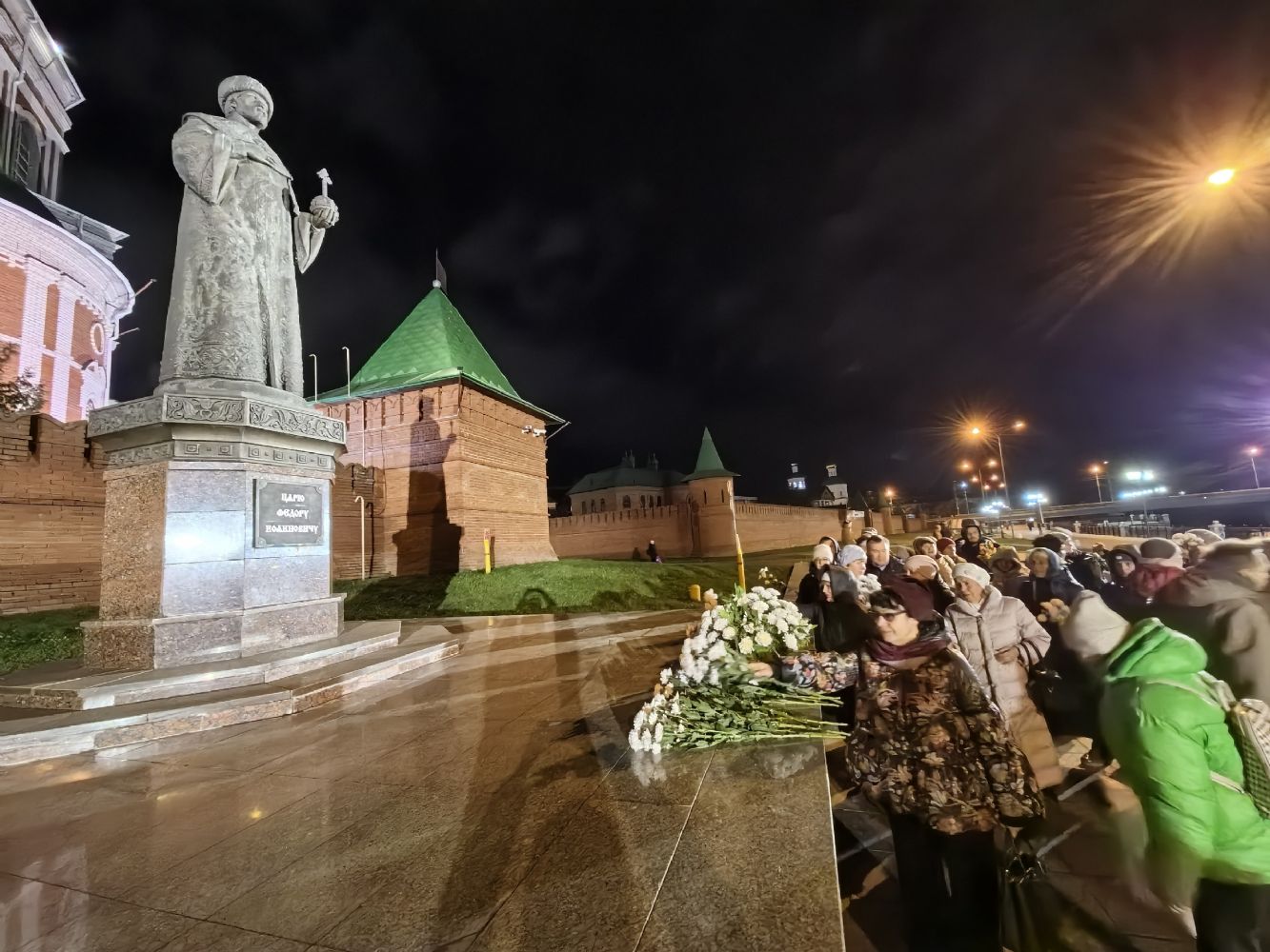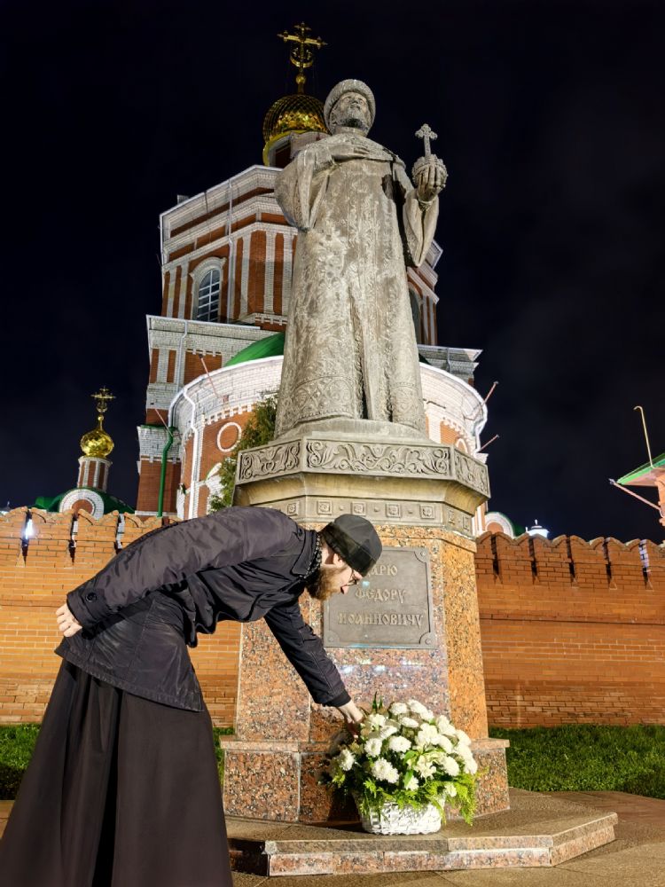 В конце мероприятия был продемонстрирован видеоролик, посвященный царю-основателю города, после чего все участники вечера, взяв в руки живые цветы, прошли на Воскресенскую набережную, где с пением величания праведному царю Феодору возложили цветы к его памятнику.