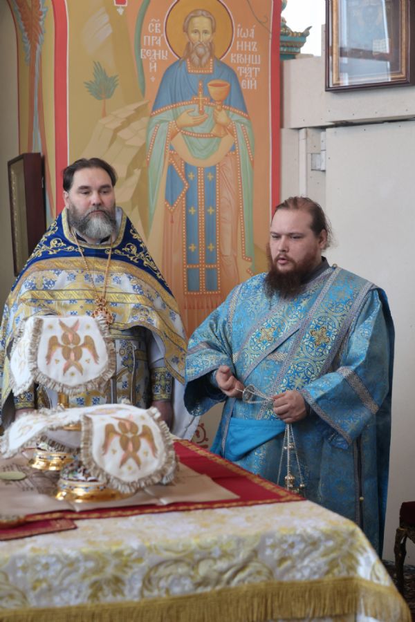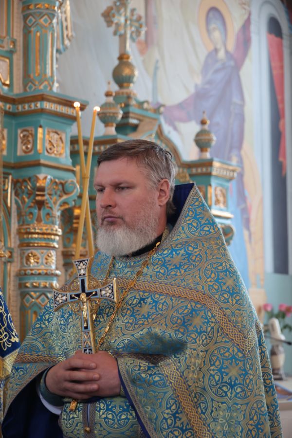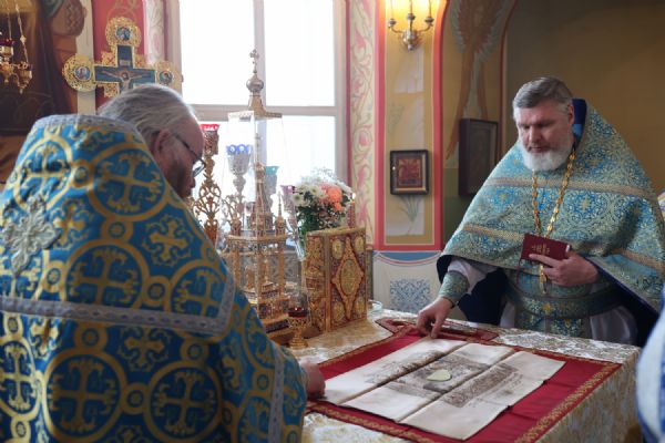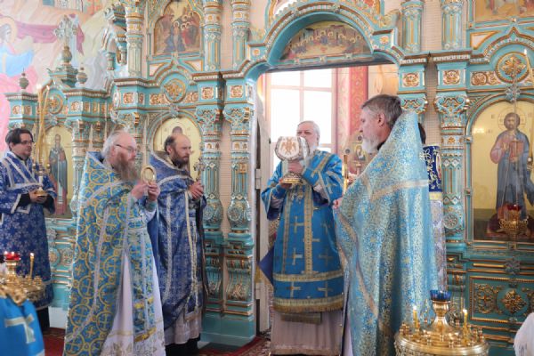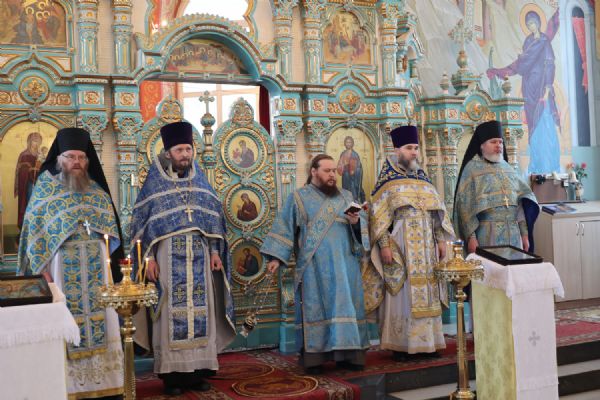 Архипастырю сослужили настоятель храма, благочинный Северного церковного округа протоиерей Владимир Власов, настоятель Покровского храма с. Марисола протоиерей Сергий Сильдушкин, настоятель храма Воздвижения Креста Господня с. Кукнур иеромонах Тихон (Белавин), клирики Никольского кафедрального собора г. Волжска иеромонах Александр (Чеборов) и диакон Иоанн Захаров. Песнопения исполнял народный хор под управлением Евгения Чигарова.