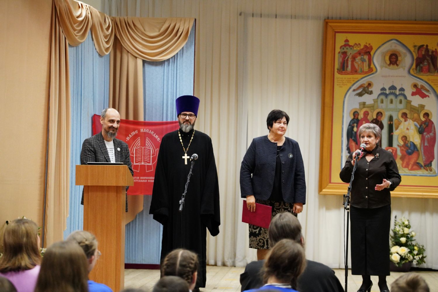 К собравшимся обратился секретарь Йошкар-Олинского епархиального управления иерей Димитрий Дьяков. Он подчеркнул, что «само название Олимпиады – «Наше наследие» говорит не только о знаниях и эрудиции, а о бережном отношении к тем духовным, культурным и историческим традициям, которые формировали судьбу нашего многонационального народа и его характер. А тема «Поволжье: народы и традиции» – особо актуальна в нынешнем году, который по решению Президента РФ объявлен Годом единства народов России». Отец Димитрий пожелал ребятам плодотворной работы, честного соревнования, ясности мысли, уважения к соперникам и благодарности своим наставникам и учителям.