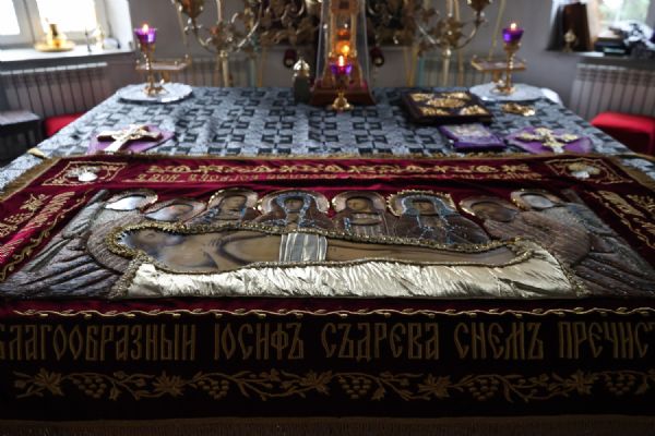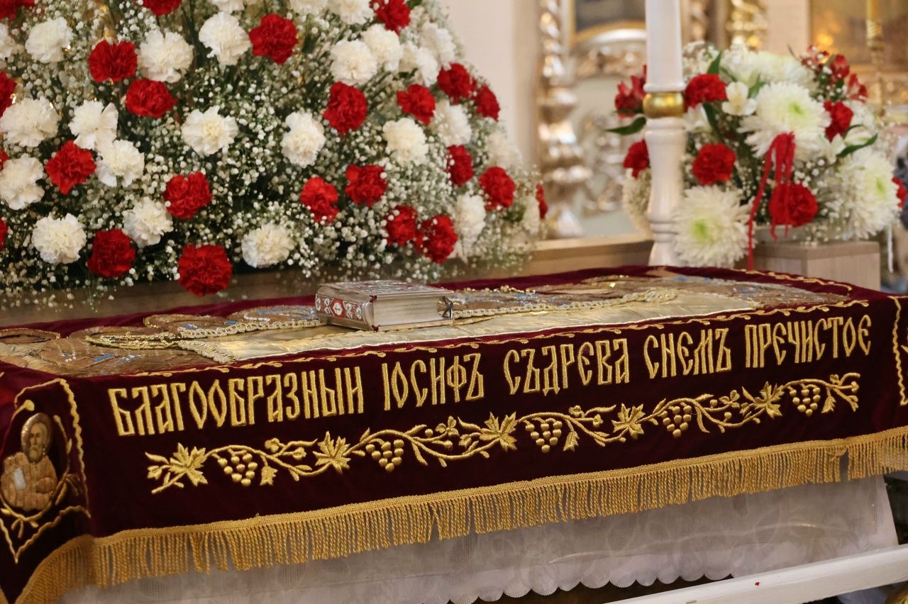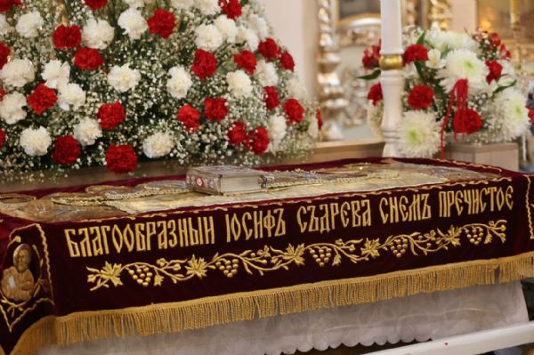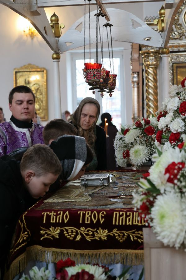 В конце вечерни при пении тропаря «Благообразный Иосиф с древа снем Пречистое Тело Твое» епископ Феофан с духовенством перенесли Плащаницу из алтаря в центр храма для всеобщего поклонения, положив её на специально подготовленную гробницу.