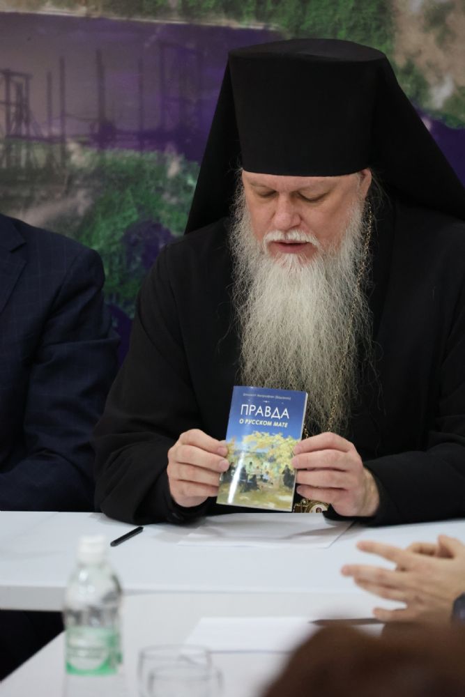 Епископ Феофан выступил с приветственным словом и подарил участникам встречи книгу митрополита Митрофана (Баданина) «Правда о русском мате», где собраны свидетельства многих людей, которые на личном опыте познали, как благодатно действует обращение человека к Богу в молитве и как совершенно противоположно действует в жизни сквернословие, которое является антимолитвой – это хула на Бога и Божию Матерь. И благодать Божия отнимается от человека, который употребляет подобные слова.