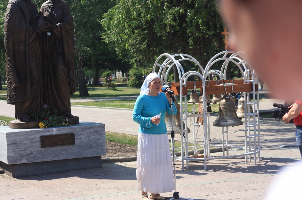 В Новосибирске прошел . 3 июня в Нарымском сквере у памятника святым благоверным князьям Петру и Февронии Муромским выпускники, ученики и преподаватели Школы звонарей собрали две передвижные звонницы.