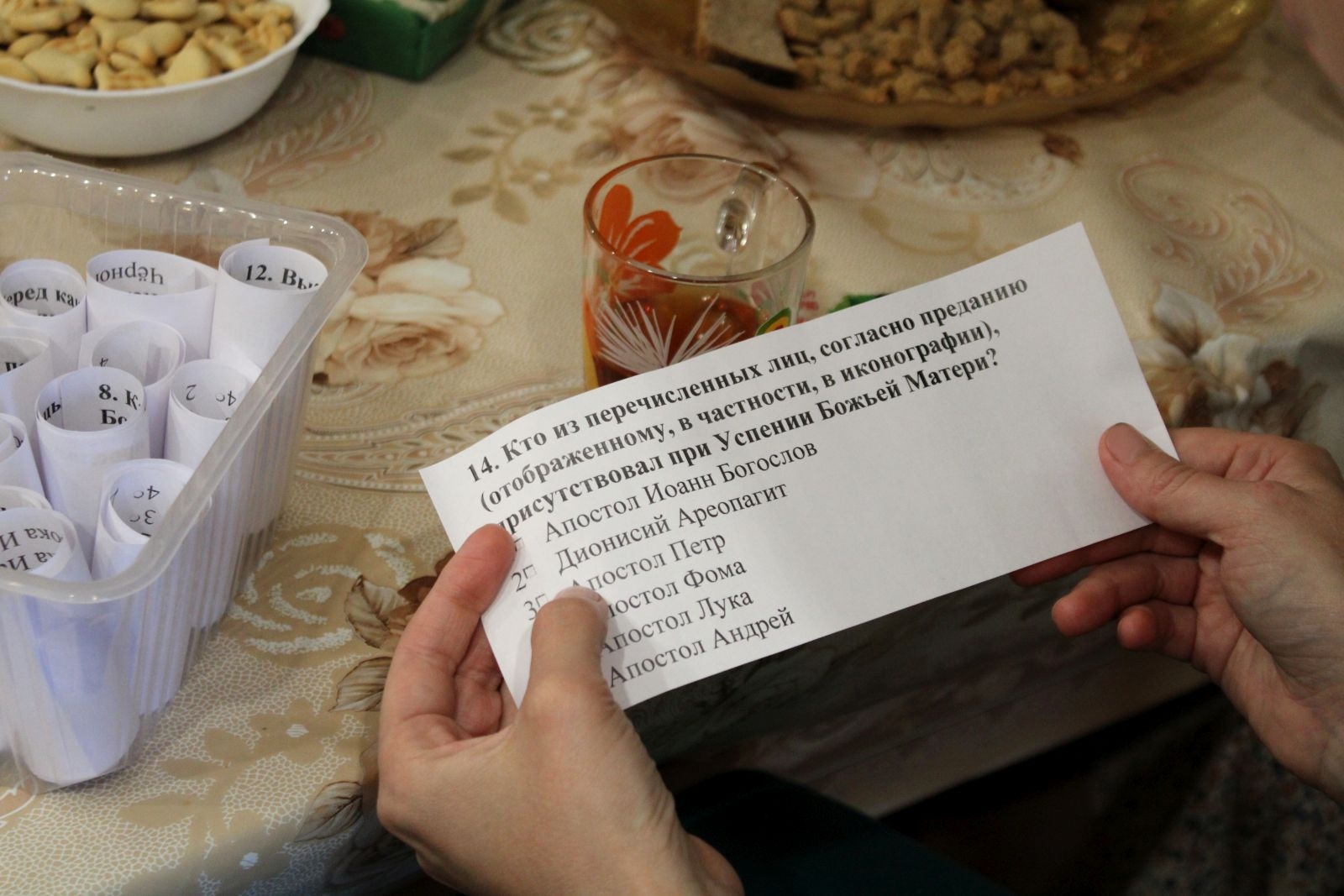 Активная часть встречи продолжилась приятным и полезным отдыхом в трапезной – за чаем с угощением шел разговор о преданиях, связанных с Божией Матерью, а свои знания по этой теме желающие смогли проверить по заданиям теста, заготовленного заранее. Гостей так впечатлило все происходящее, что они решили задержаться на вечернее богослужение в Покровском храме.
