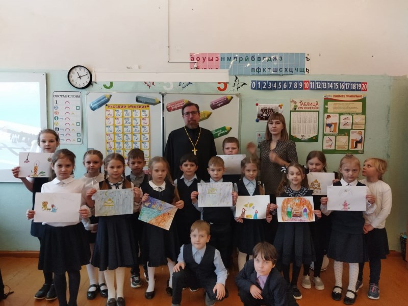 В школе состоялась беседа с учащимися младших классов на тему Рождества Христова и Крещения Господня. А дети поделились историями о том, как они провели эти светлые праздники, рассказали стихи о Рождестве и подарили свои рисунки для военнослужащих войсковой части.
