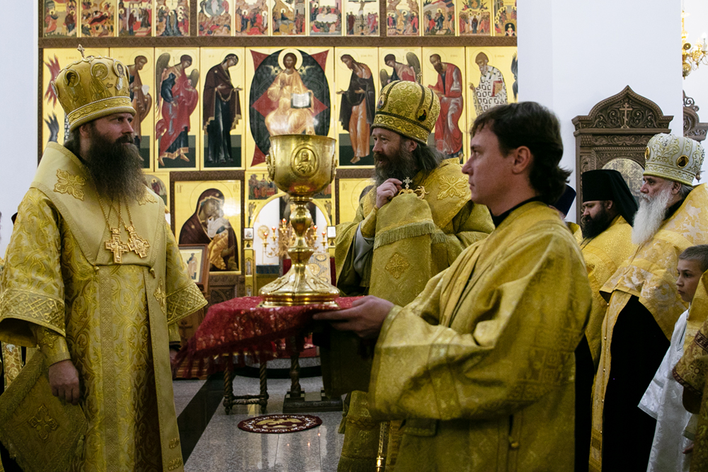 По окончании Литургии митрополит Ростислав и епископ Силуан обменялись приветственными словами. Предстоятель Колпашевской епархии поблагодарил Главу митрополии и благотворителей за разностороннюю поддержку новообразованной епархии, а духовенство и мирян за усердные труды и молитвы. Митрополит Ростислав преподнес в дар Колпашевской епархии евхаристическую чашу (потир) и икону Трёх Вселенских учителей и святителей Василия Великого, Григория Богослова и Иоанна Златоуста с частицами их мощей.