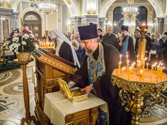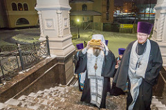 После встречи духовенством было совершено молебное пение Пресвятой Богородице и святителю Луке, после чего архипастырь обратился к присутствующим с проповедью.