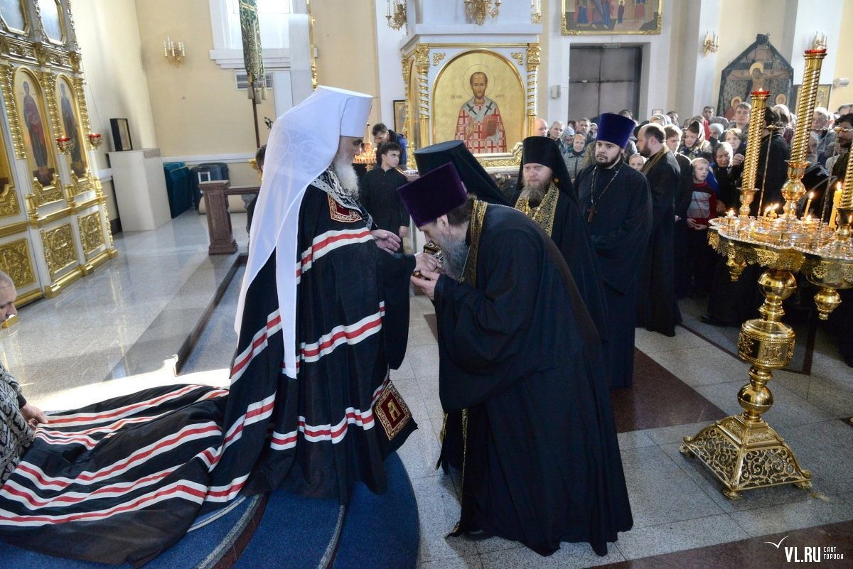 «Без прощения мы не можем получить прощения грехов от Отца Небесного, — рассказал во время церковной службы митрополит Владивостокский и Приморский Вениамин. – В Прощеное воскресенье, сообразно с Евангельским чтением, христиане имеют благочестивый обычай просить друг у друга прощения грехов, ведомых и неведомых обид и принимать все меры к примирению с враждующими. Это первый шаг на пути к Великому посту».
