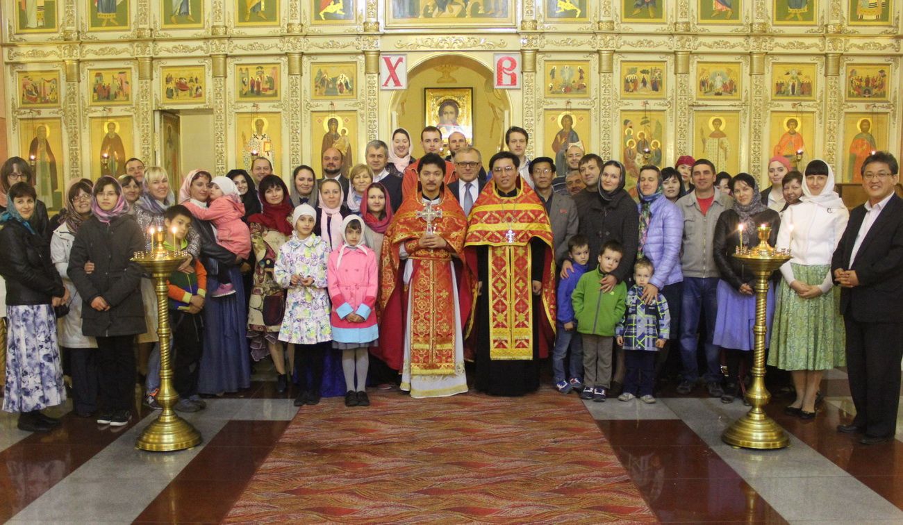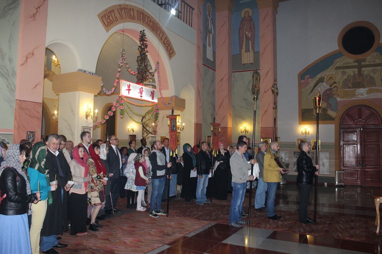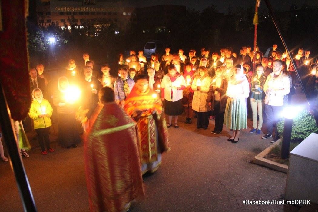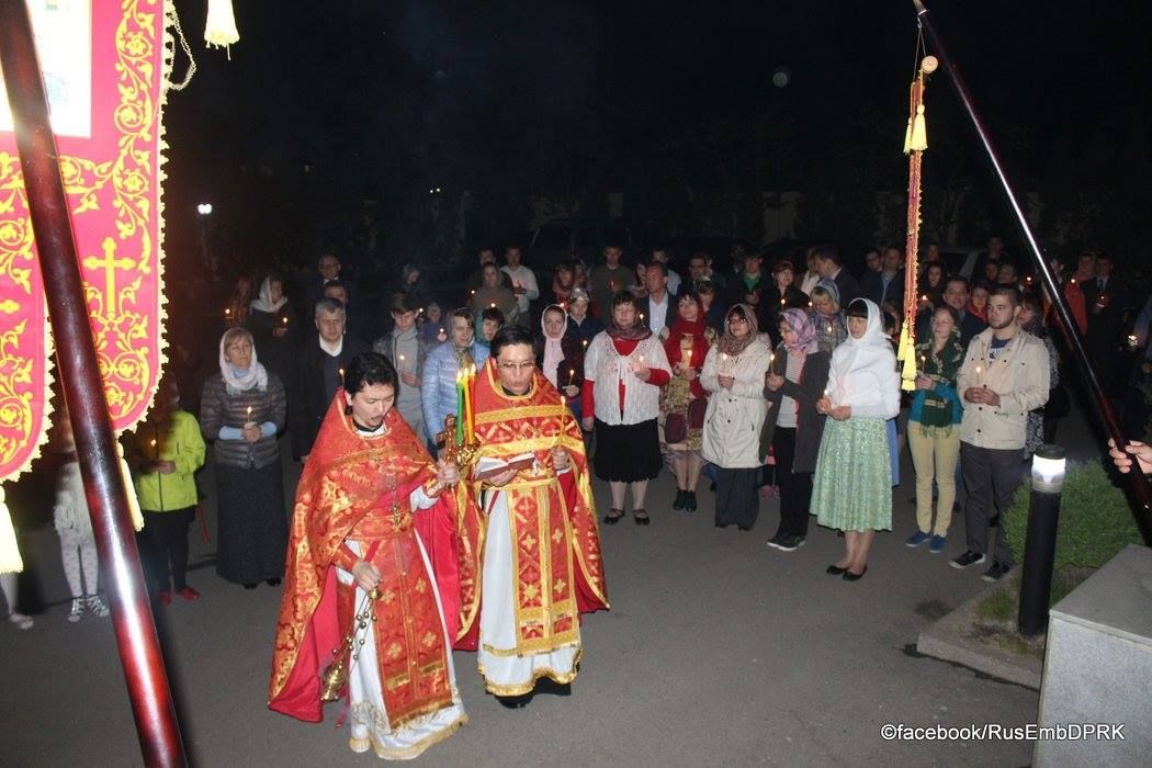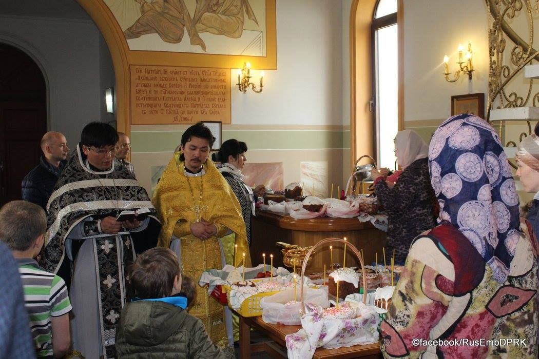 Пхеньян (КНДР). По согласованию с управлением по зарубежным учерждениям Московской Патриархии в дни празднования Пасхи столицу КНДР посетила делегация Владивостокской епархии. По благословению митрополита Вениамина клирик Успенского храма г. Владивостока протоиерей Андрей Калчев возглавил церковный визит в приход православного Свято-Троицкого храма. 29 апреля состоялось освящение новой школы при посольстве РФ в КНДР. 30 апреля была совершена Божественная литургия Великой Субботы, по окончании которой прошло освящение пасхальных куличей и яиц. В праздничную ночь многие прихожане храма исповедовались. Вокруг храма состоялся крестный ход и после него - пасхальная заутреня и литургия, по окончании которой было оглашено Пасхальное послание Святейшего Патриарха Кирилла.