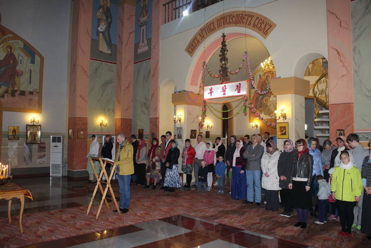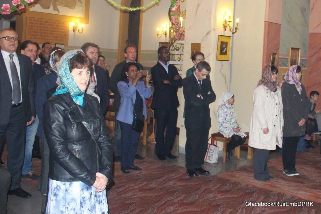 На пасхальном богослужении в храме находились посол РФ В КНДР Мацегора А. И., сотрудники российского Посольства в КНДР и многочисленные члены их семей, а также представители ряда дипломатических миссий в КНДР: Чехии, Сирии, Болгарии, Франции, Румынии, ООН, группа туристов из России.