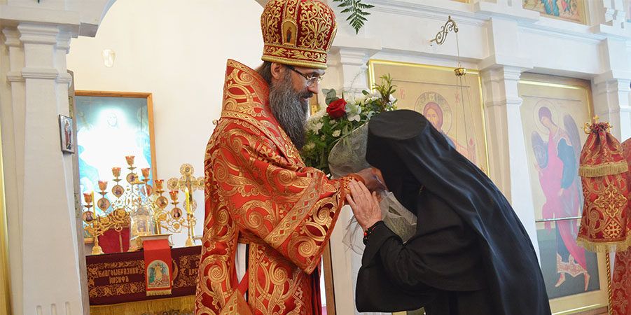 Владыка Иннокентий за богослужением сердечно поздравил Досточтимую матушку Марию (Пономареву), игумению женского монастыря на Седанке, насельниц Марфо-Мариинской обители и всех верных христианок с праздником.