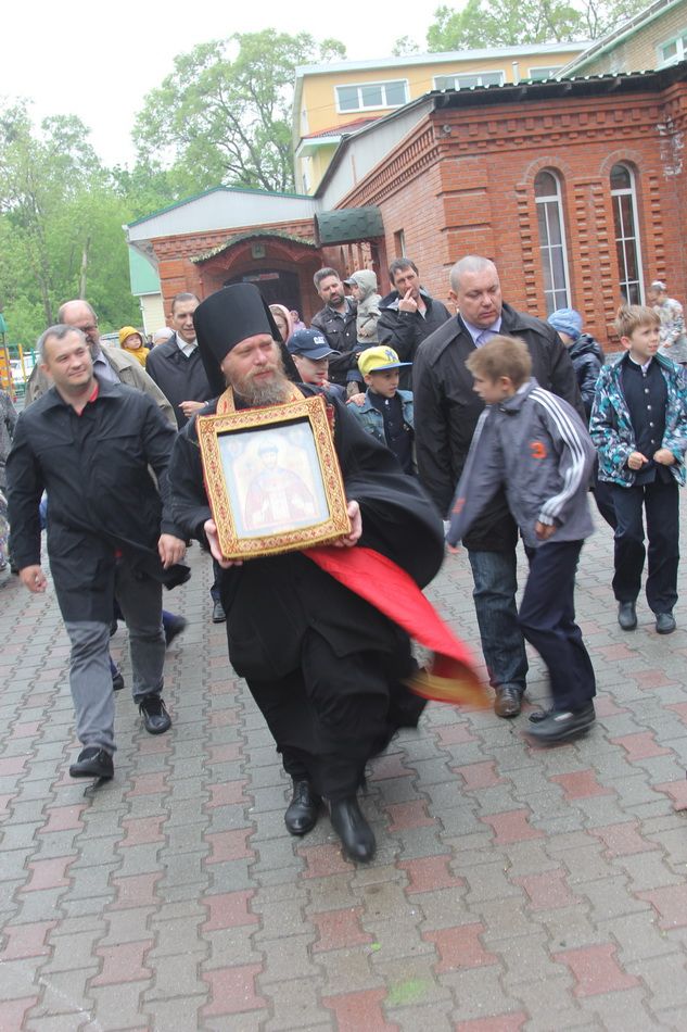 По совершении литургии состоялась Торжественная встреча чудотворной иконы святого страстотерпца царя Николая. Принесение святыни во Владивосток организовано Оргкомитетом по увековечению памяти посещения в 1891 году Южно-Уссурийского края Цесаревичем Николаем Александровичем. 125 лет назад, 25 мая (12 мая по ст. ст.) 1891 года, в ходе большого Восточного путешествия, Цесаревич Николай Александрович (будущий Государь Николай II) сошел на берег во Владивостоке, в районе арки. По этому случаю завтра, 25 мая 2016 года, митрополит Владивостокский и Приморский Вениамин совершит у Николаевской арки (ул. Петра Великого) праздничный молебен перед святым образом царя страстотерпца.