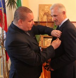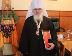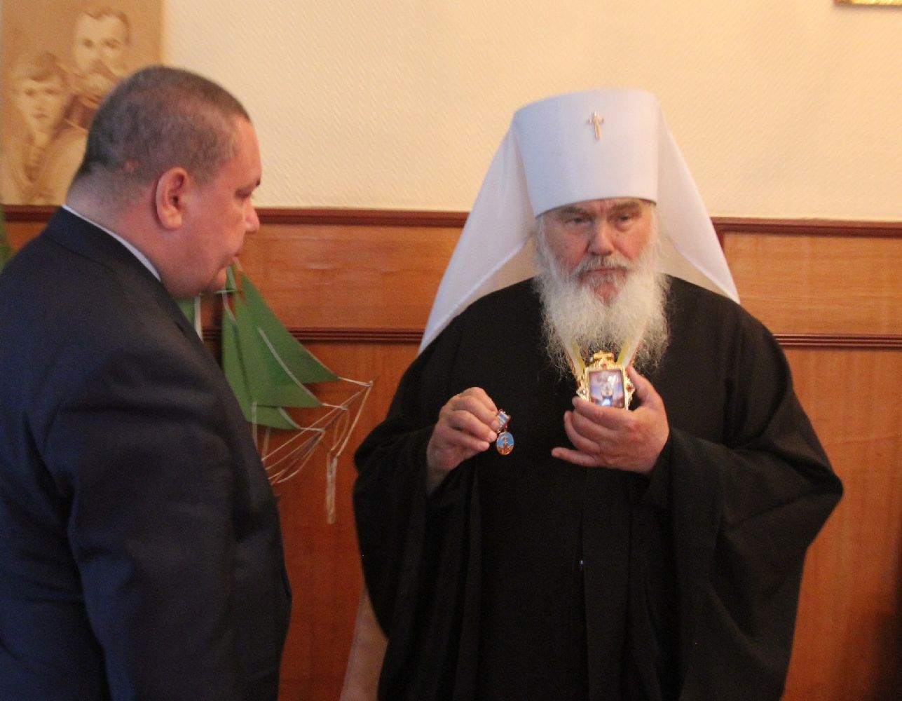 Со своей стороны Высокопреосвященнейший владыка Вениамин — за труды по принесению в Приморский край чудотворного мироточивого образа святого царя страстотерпца Николая и участие в торжествах по случаю 125-летия посещения Цесаревичем Николаем Александровичем Владивостока и Южно-Уссурийского края, — вручил:
