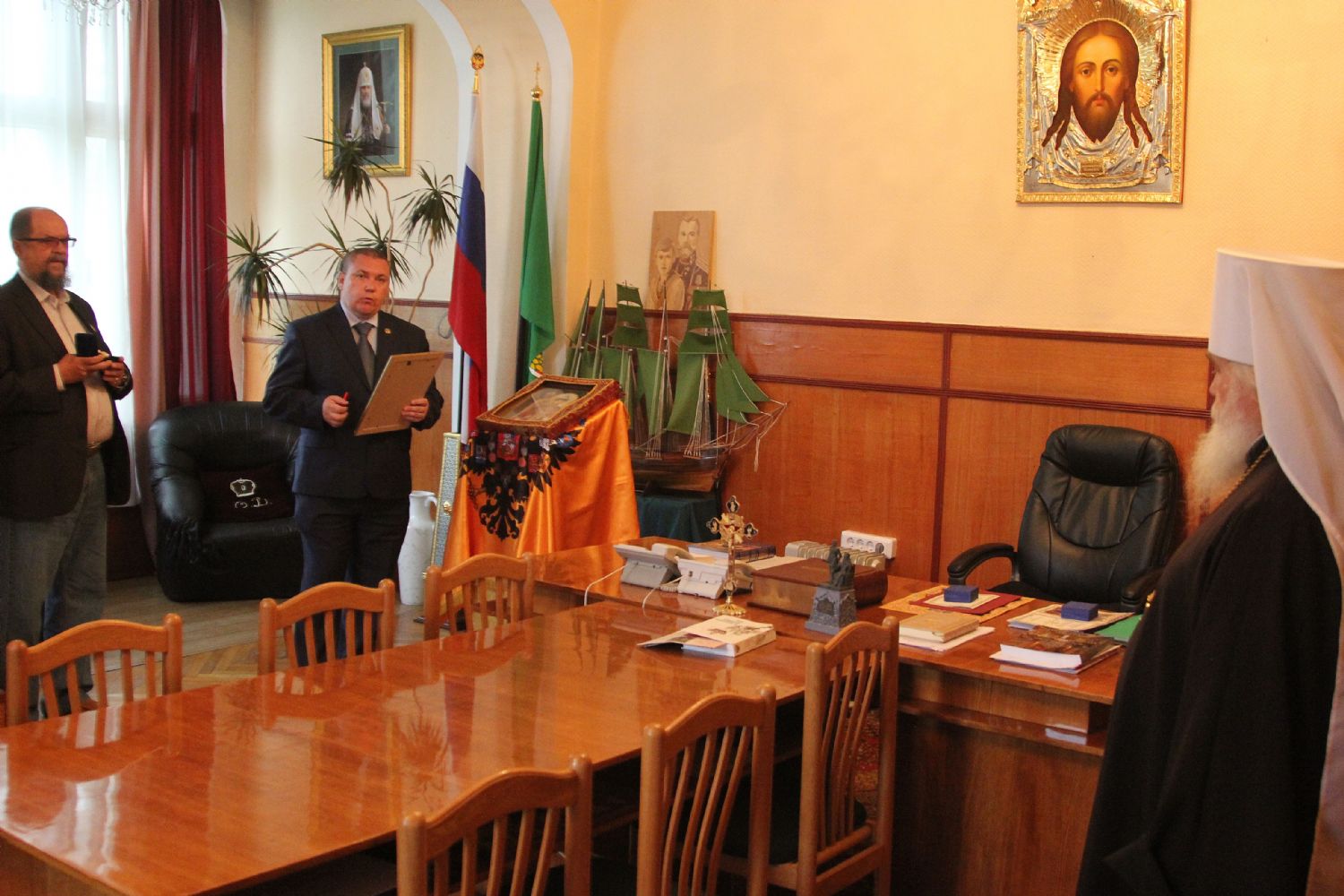 Владивосток. В рабочей резиденции Главы Приморской митрополии 30 мая 2016 года состоялась встреча с организаторами принесения во Владивосток чудотворного образа святого царя страстотерпца Николая — в рамках «Царских дней», приуроченных к празднованию 125-летия посещения цесаревием Николаем Александровичем Романовым Южно-Уссурийского края.
