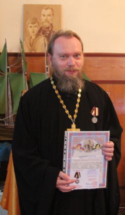 От лица Войсковой Православной миссии (г.Москва) ее начальник И.Е. Смыков также вручил Юбилейную медаль, учрежденную к 100-летию Первой мировой войны, с изображением на лицевой стороне профиля Государя Николая Александровича Романова. За вклад в духовно-нравственное возрождение Отечества и помощь в проведении «Царских дней во Владивостоке», юбилейные медали были вручены: