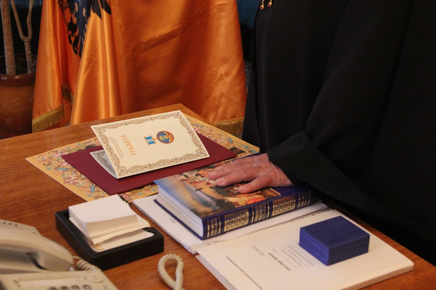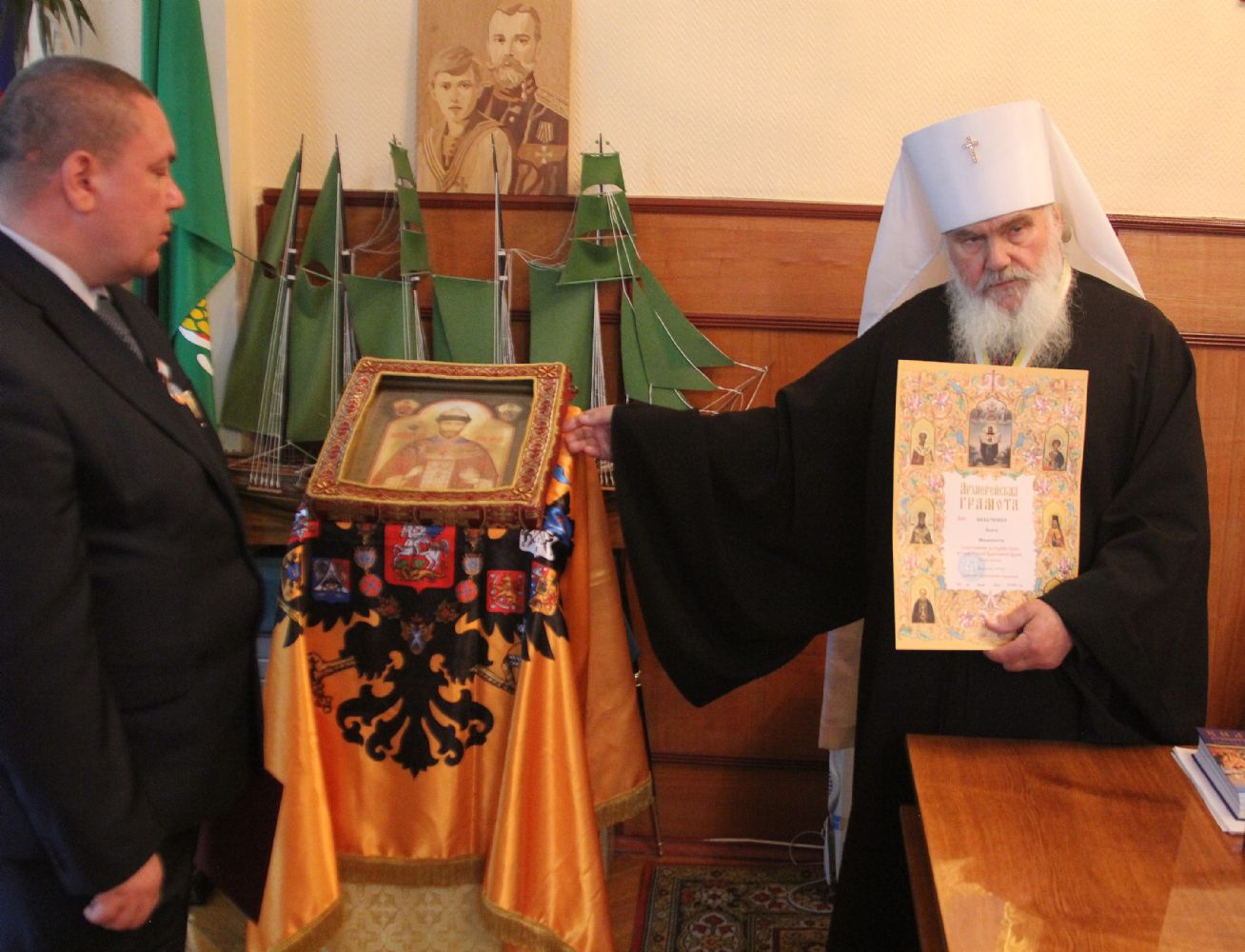 - Архиерейскую грамоту — члену Попечительского совета Войсковой Православной миссии, хранителю святого мироточивого образа царя страстотерпца Олегу Ивановичу Бельченко.