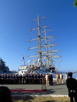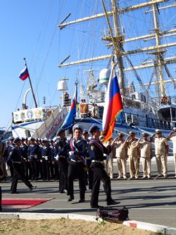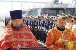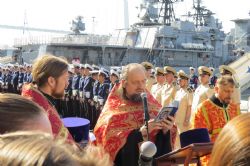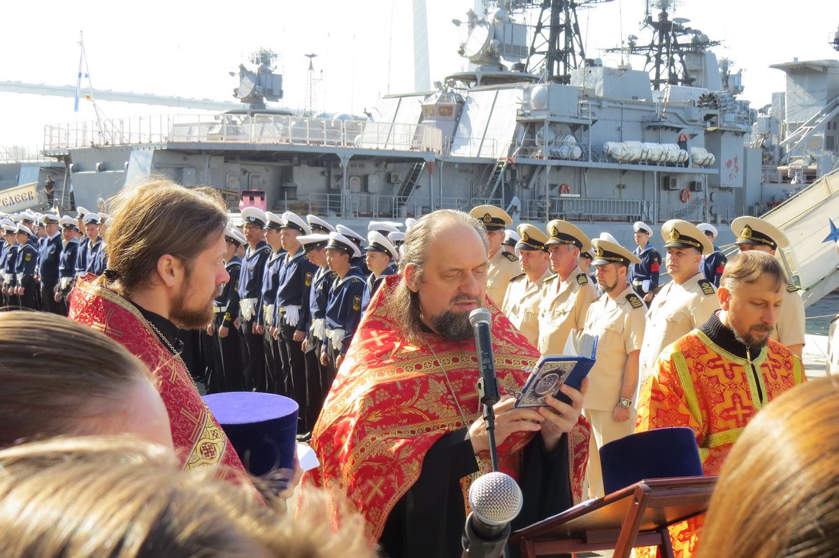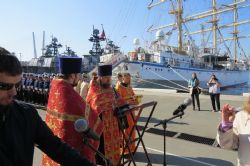 Провожали фрегат традиционно, молебном. С борта «Надежды» на пирс вынесли походный иконостас храма в честь святителя Николая Чудотворца. Настоятель Казанского храма Владивостока в сослужении иерея Романа Бурдинского отслужил молебен, благословил предстоящий поход и обратился к экипажу фрегата с пастырским напутствием.