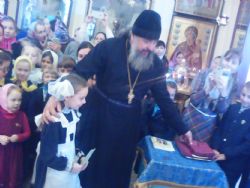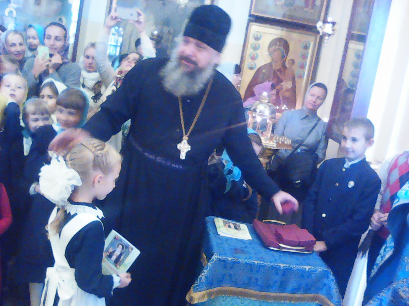По окончании богослужения отец Игорь в присутствии педагогического состава вручил первоклассникам значки гимназиста и ученические свидетельства.