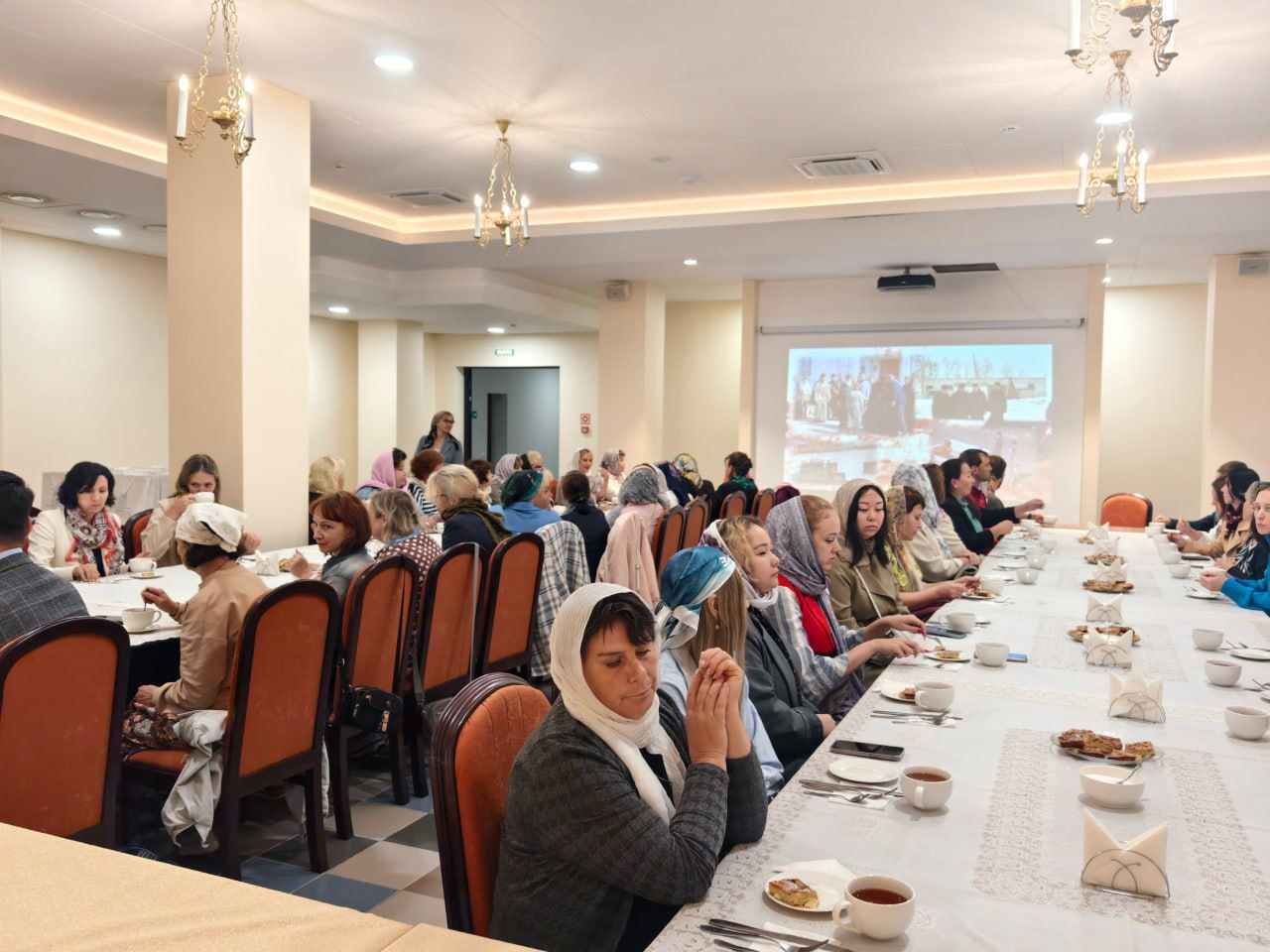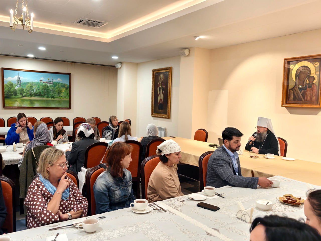 Беседа продолжилась в трапезной, за столами с чаем и пирогом. Владыка рассказал о своём жизненном и духовном пути, а через него — о буднях и праздниках Церкви, о служении Христовой истине, о верности Богу и любви к людям.