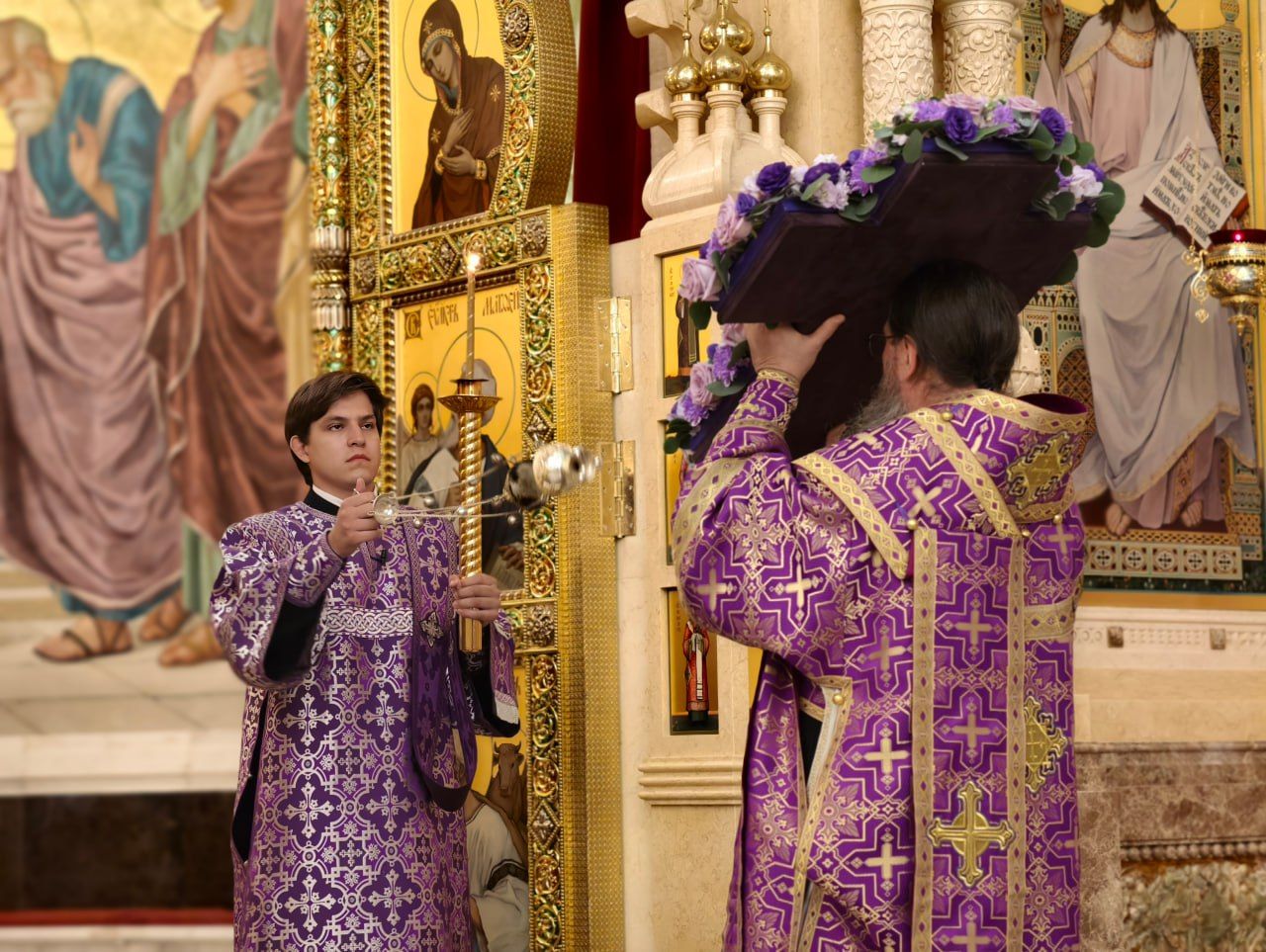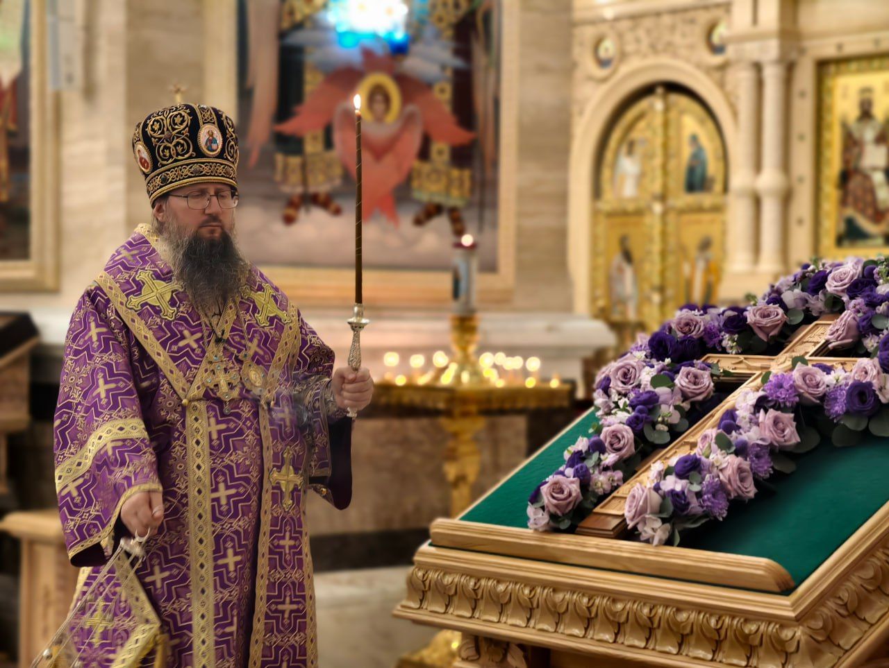 Украшенный цветами крест митрополит Павел вынес из алтаря на середину храма. Под непрерывно звучащую молитву «Господи, помилуй» владыка, стоя лицом на восток, трижды поднял и опустил крест. Затем крест омыли благовонной водой, которую завтра после Божественной Литургии раздадут народу.