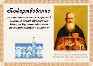 «Желающие внести именное пожертвование могут сделать это в лавке нашего храма, — пояснил Кирилл Кочнев. — Школа возводится только за счет благотворителей, поэтому мы просим православных христиан не охладевать в поддержке нашего начинания. Верим, что милостью Божией и молитвами святого праведного Иоанна Кронштадтского оно в скором времени благополучно завершится».