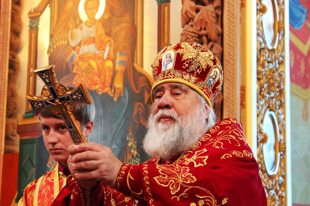 Его Высокопреосвященству сослужили представители духовенства епархии. Во время Малого входа настоятель собора иерей Дионисий Фокин был возведен в сан протоиерея.