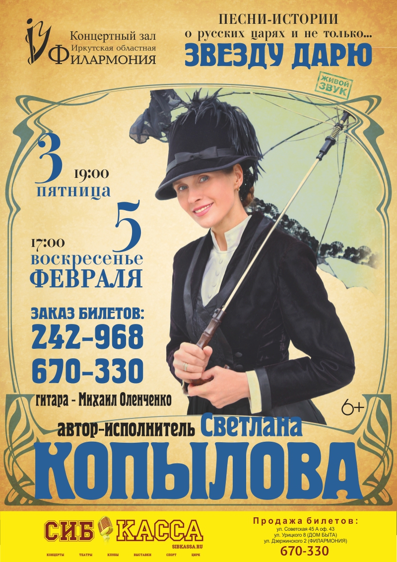 3 февраля в 19.00 и 5 февраля в 17.00 в концертном зале Иркутской областной филармонии, пройдут концерты Светланы Копыловой. Заказ билетов по тел.: 242-968 и 670-330.