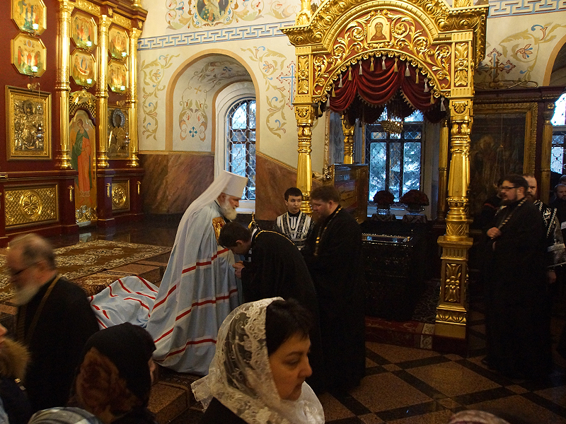 По окончании богослужения владыка Вадим преподал крест для целования духовенству и мирянам, которые собрались в этот вечер в Знаменском соборе, чтобы получить благословение на прохождение Великого поста.