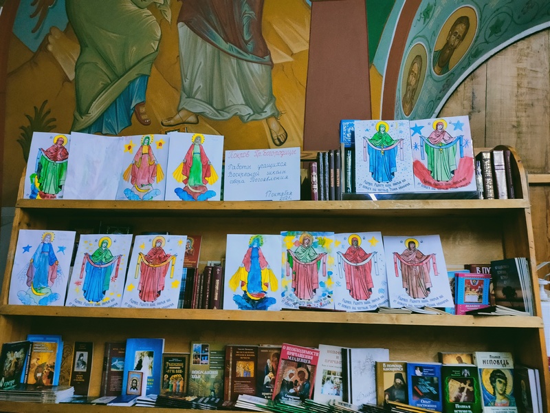 При выходе их храма прихожане могли увидеть выставку работ-раскрасок, посвященных празднику Покрова Пресвятой Богородицы, которые выполнили в этот день маленькие ученики воскресной школы собора.