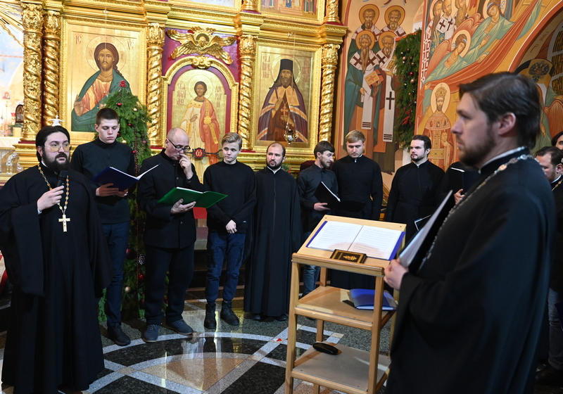 Всенощную сопровождало пение двух хоров: епархиального мужского хора «Знамение» под управлением Трофима Поподько и хора кафедрального Богоявленского собора под управлением регента Галины Левиной.