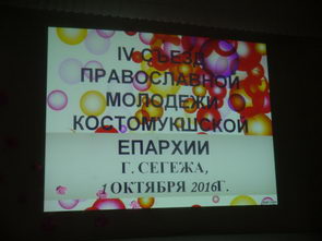 По благословению митрополита Петрозаводского и Карельского Константина сотрудники молодежного отдела Петрозаводской и Карельской епархии принял участие в прошедшем в Сегеже 1 октября 2016 года IV Съезде православной молодежи Костомукшской епархии. Проведение молодежного съезда началось с Божественной литургии в Троицком храме г. Сегежа. Основная часть мероприятия прошла в актовом зале Северного колледжа.С приветственным словом обратился иеромонах Мануил (Полищук), поблагодарив от имени Правящего Архиерея, епископа Игнатия, всех участников съезда, рассказав о тех трудностях и ситуациях, с которыми сталкивается современная молодежь.