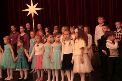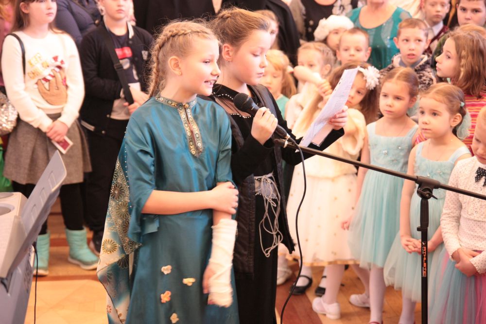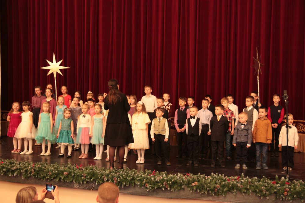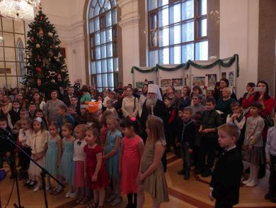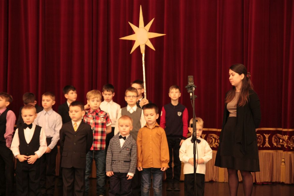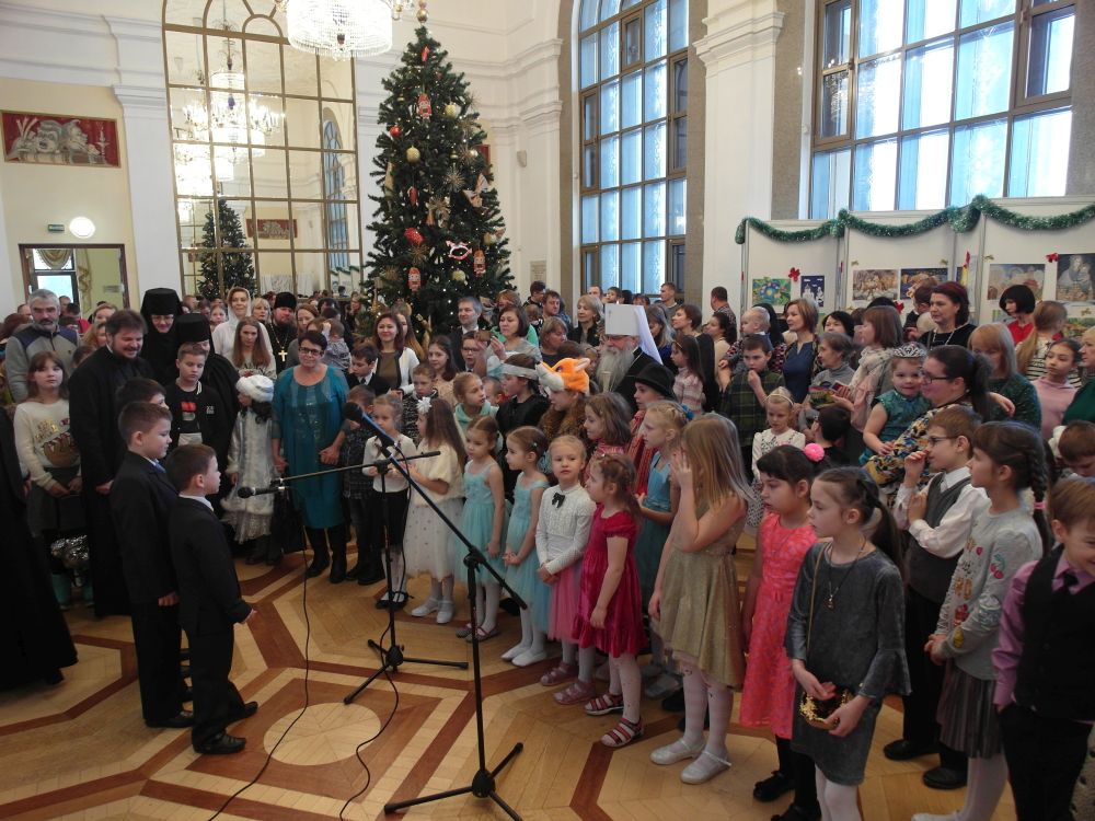 Ведущий программы клирик Александро-Невского кафедрального собора иерей Евгений Барышев сказал несколько слов о празднике и пригласил на сцену хор Детской воскресной школы Александро-Невского кафедрального собора. Ребята исполнили 3 номера: "Небо и земля", «Рождество Христово, ангел прилетел», «Много было в небе звезд».