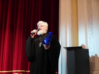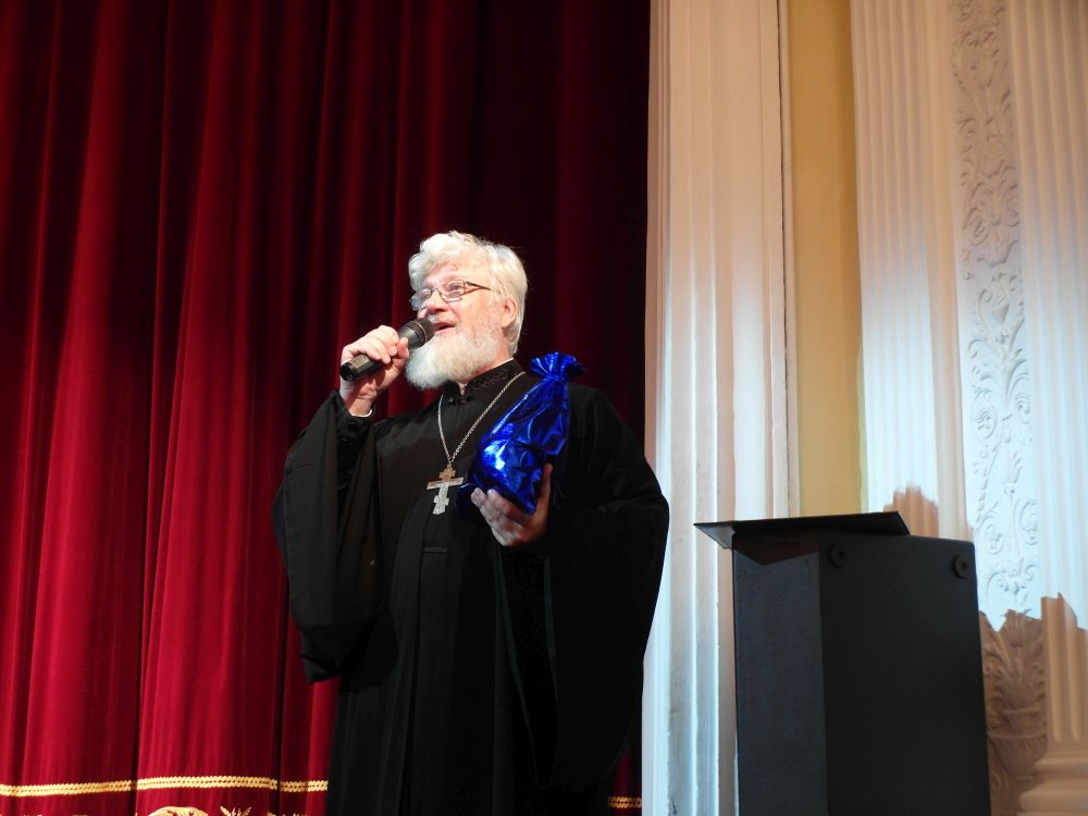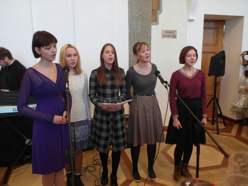 В начале весь зал спел праздничный тропарь Рождества Христова. Тем, кто помнил не все слова из тропаря, помогла бегущая строка над сценой.