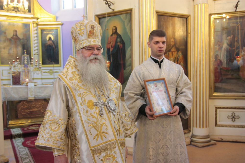 В завершении митрополит Константин поздравил с тридцатилетием старшего иподиакона Димитрия Пиккарайнена. Димитрий совмещает иподиаконское послушание с работой в МЧС. Владыка отметил нелегкий труд Димитрия, вручил ему Архиерейскую грамоту и вспомнил случай, когда он после ночной смены, устранения пожара, уставший и пропахший дымом, но пришел на богослужение.