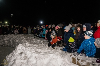 Далее, основные действия проходили на территории храма. В этом году организаторов мероприятия ожидал приятный сюрприз. Его преподнесла погода. Не было ни ветра, ни мороза. Снег огромными белыми хлопьями тихонько ложился на землю, что придавало храму особо живописный вид. Как и всегда праздник собрал множество народа. Люди пришли семьями, с родными, друзьями, знакомыми. Многие приехали из Медвежьегорска. По традиции Приход Никольского храма организовал участие в праздничном мероприятии юных медвежьегорцев. Так, автобусы привезли учащихся из всех школ города.